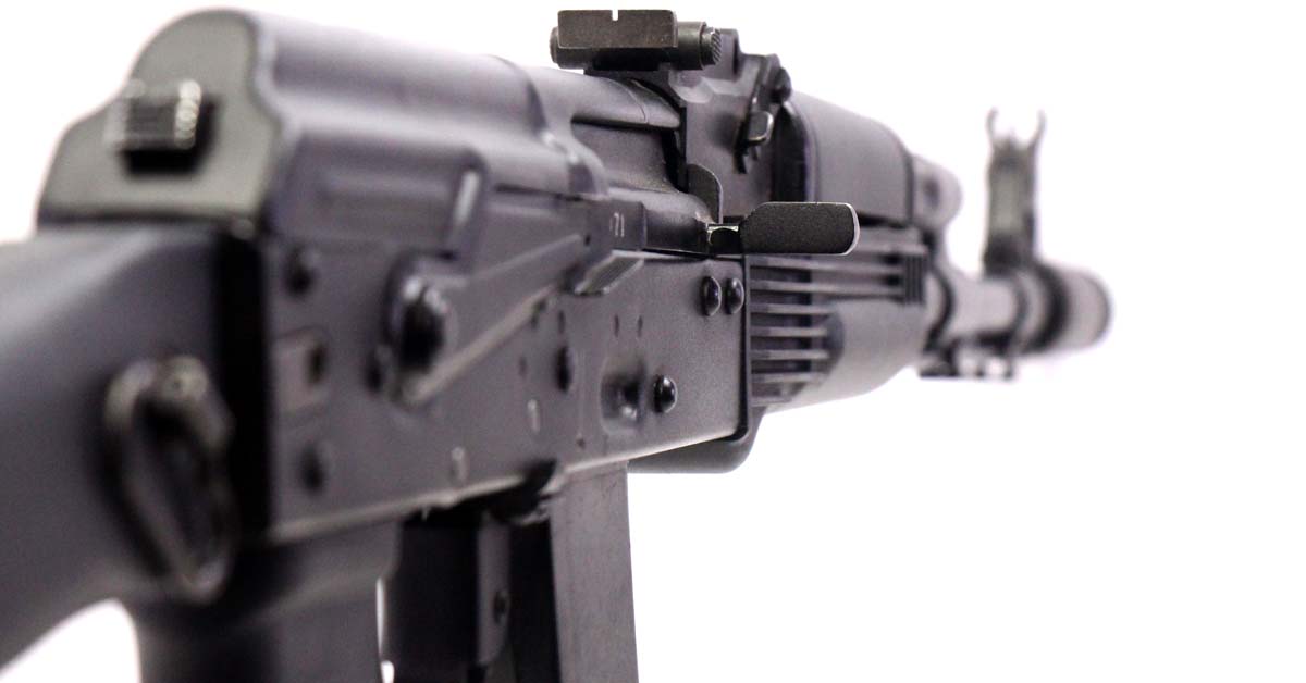 This is a used Arsenal SLR 104FR AK-74 rifle chambered in 5.45x39. It features a 16-inch barrel with muzzle brake, 30-round magazine, tangent rear sight, wing protected front sight, side optics rail, ALG trigger, polymer side-folding stock, and black painted finish. Overall, this rifle is in good condition with normal wear on the receiver. Bore condition is good with crisp rifling. This would be a good choice for home defense. Buy online today!