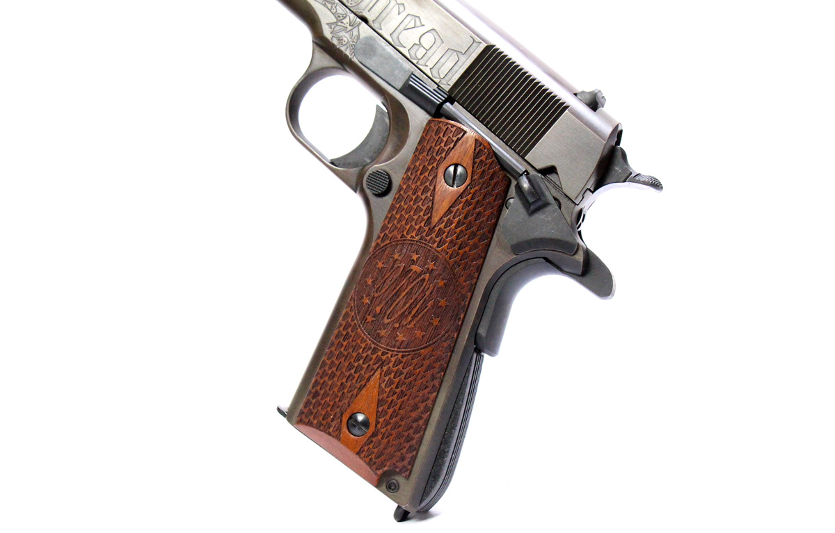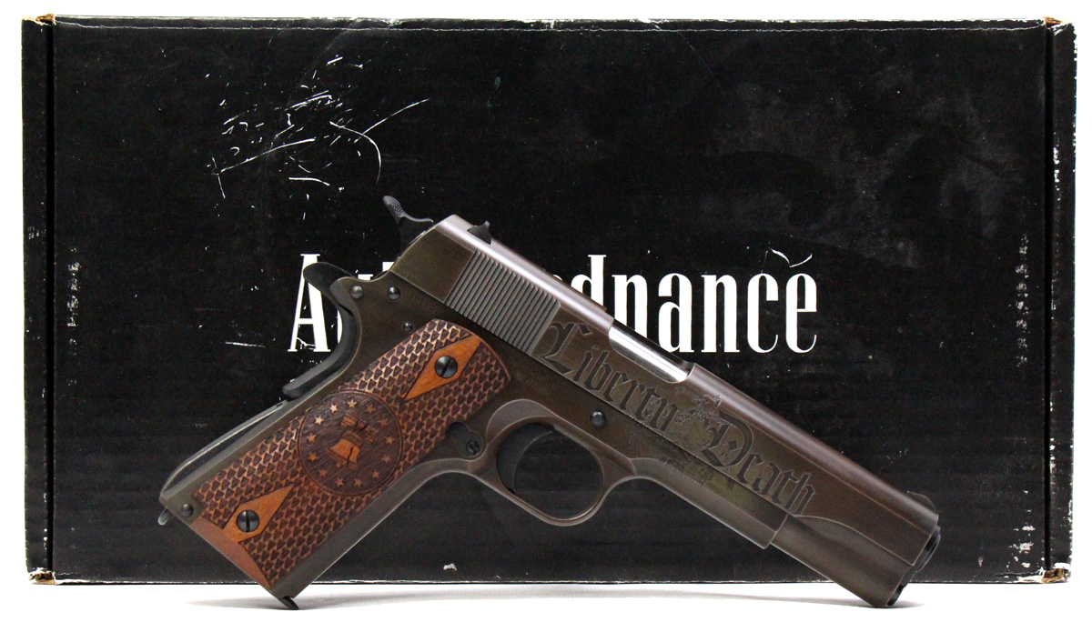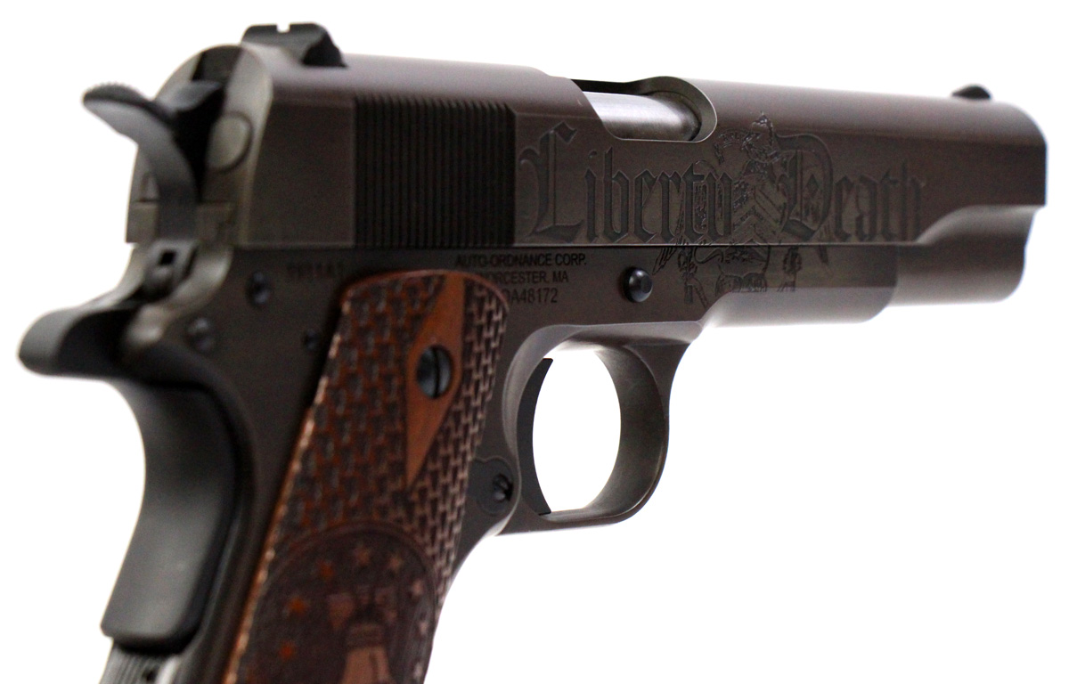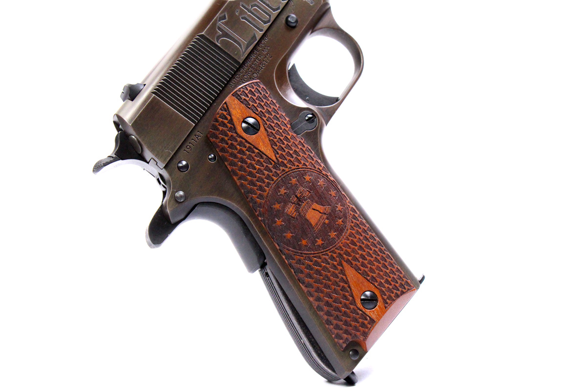 This is a used Auto Ordnance Liberty 1911 pistol chambered in 45 ACP. It features a 5-inch barrel, 7-round magazine, thumb safety, grip safety, wood grips, and engraved slide with distressed Cerakote finish. Includes factory box and manual. Overall, this pistol is in good condition with normal use wear on the slide and barrel. This would be a good choice for target shooting. Buy online today!