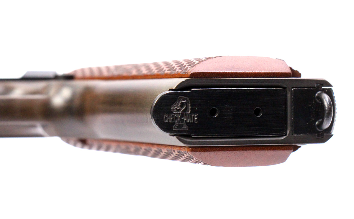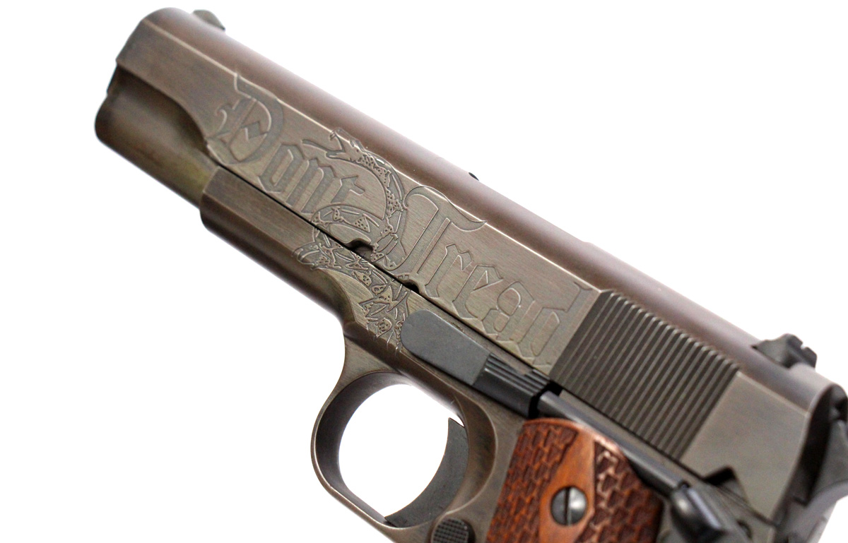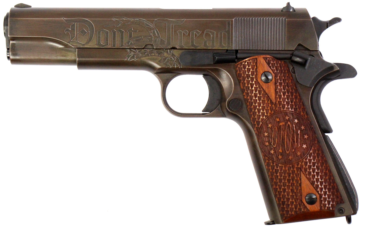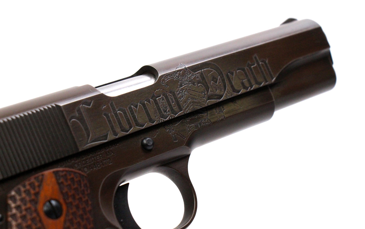 This is a used Auto Ordnance Liberty 1911 pistol chambered in 45 ACP. It features a 5-inch barrel, 7-round magazine, thumb safety, grip safety, wood grips, and engraved slide with distressed Cerakote finish. Includes factory box and manual. Overall, this pistol is in good condition with normal use wear on the slide and barrel. This would be a good choice for target shooting. Buy online today!