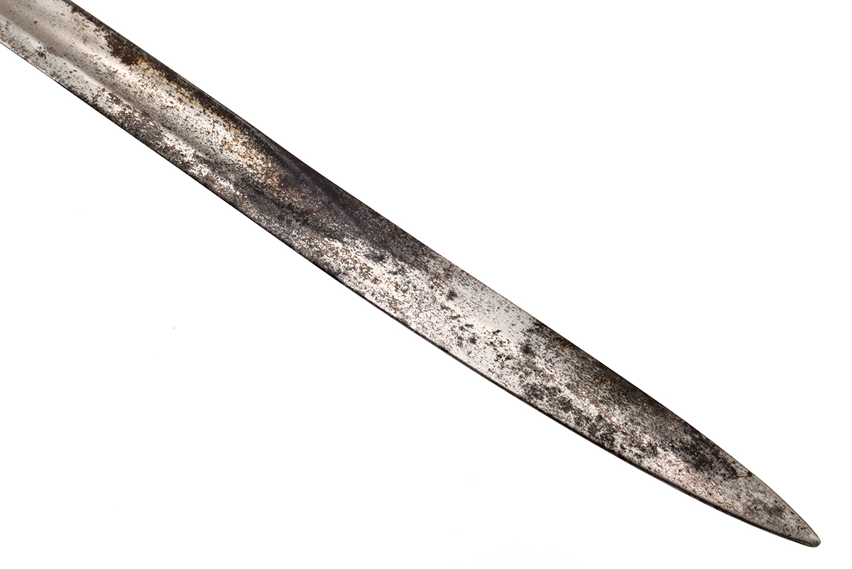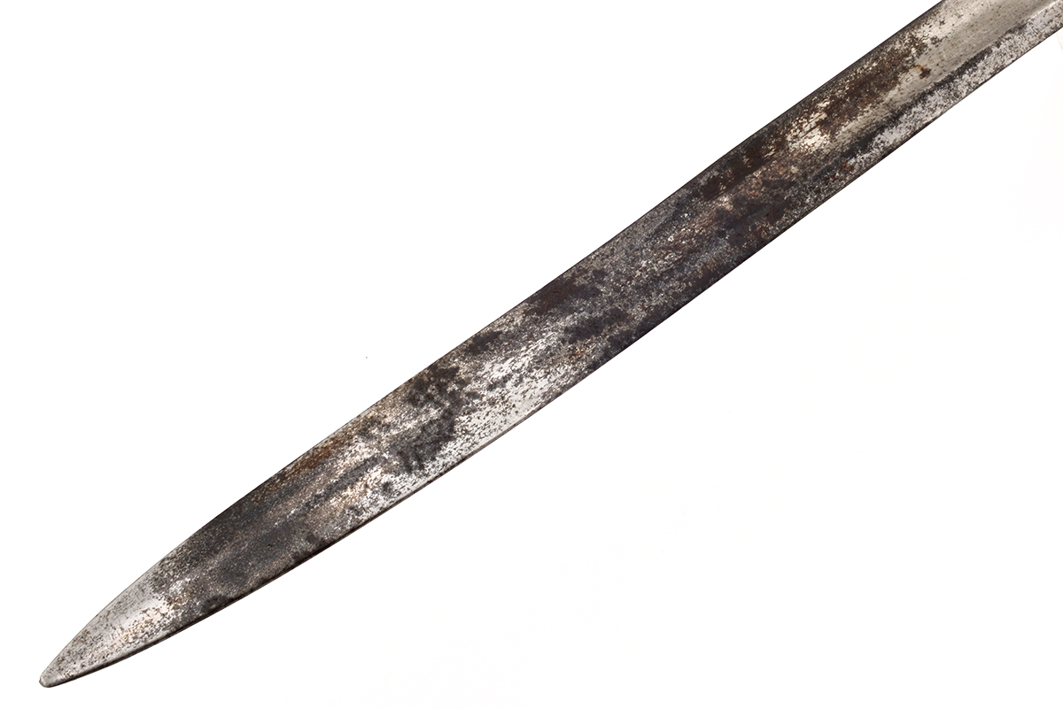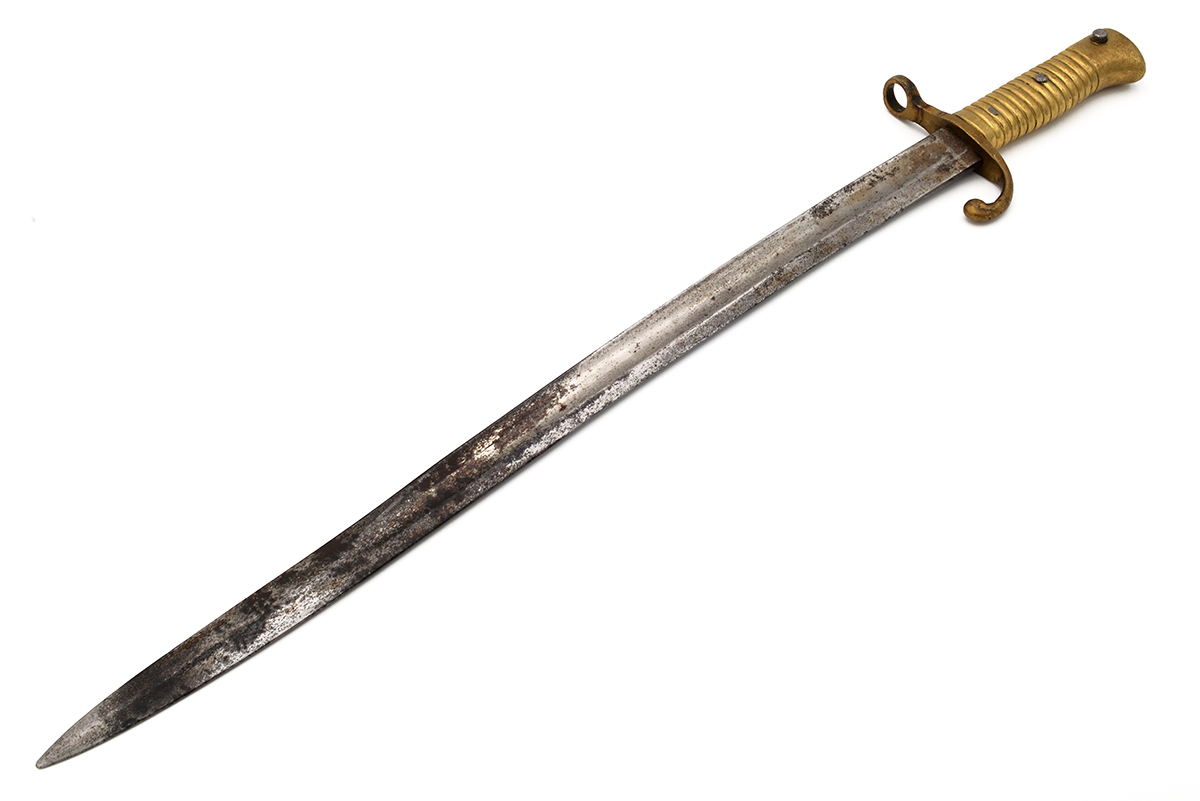 This is an Bavarian (German) M1869 Werder bayonet. It features an 18.25" "yataghan" style blade and overall length of 23", the ricasso is marked "SOLINGEN" in an arc over "W & ST" indicating Weyersberg & Stamm manufacture. Overall condition is fair with the original edge, there is quite a bit of tarnishing and corrosion to blade flats. There is no scabbard included with this bayonet. Buy online today!