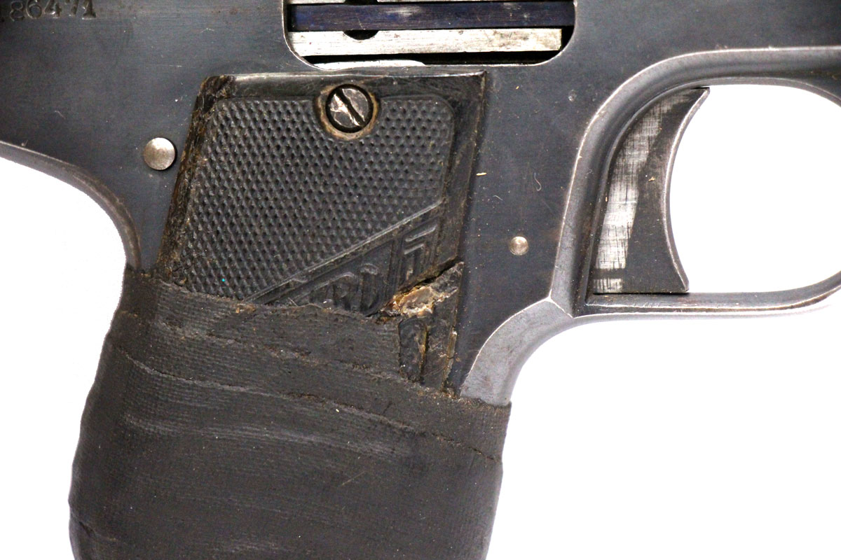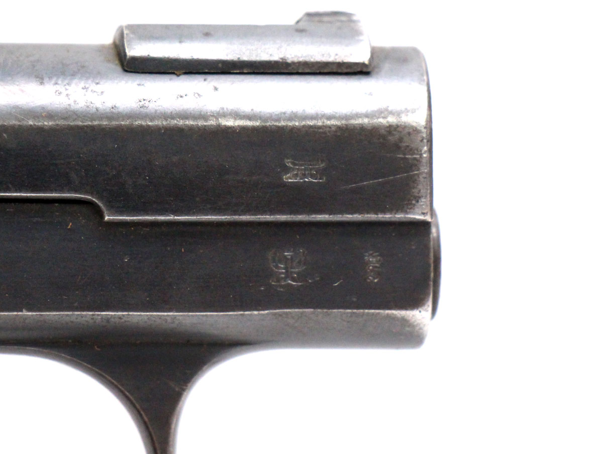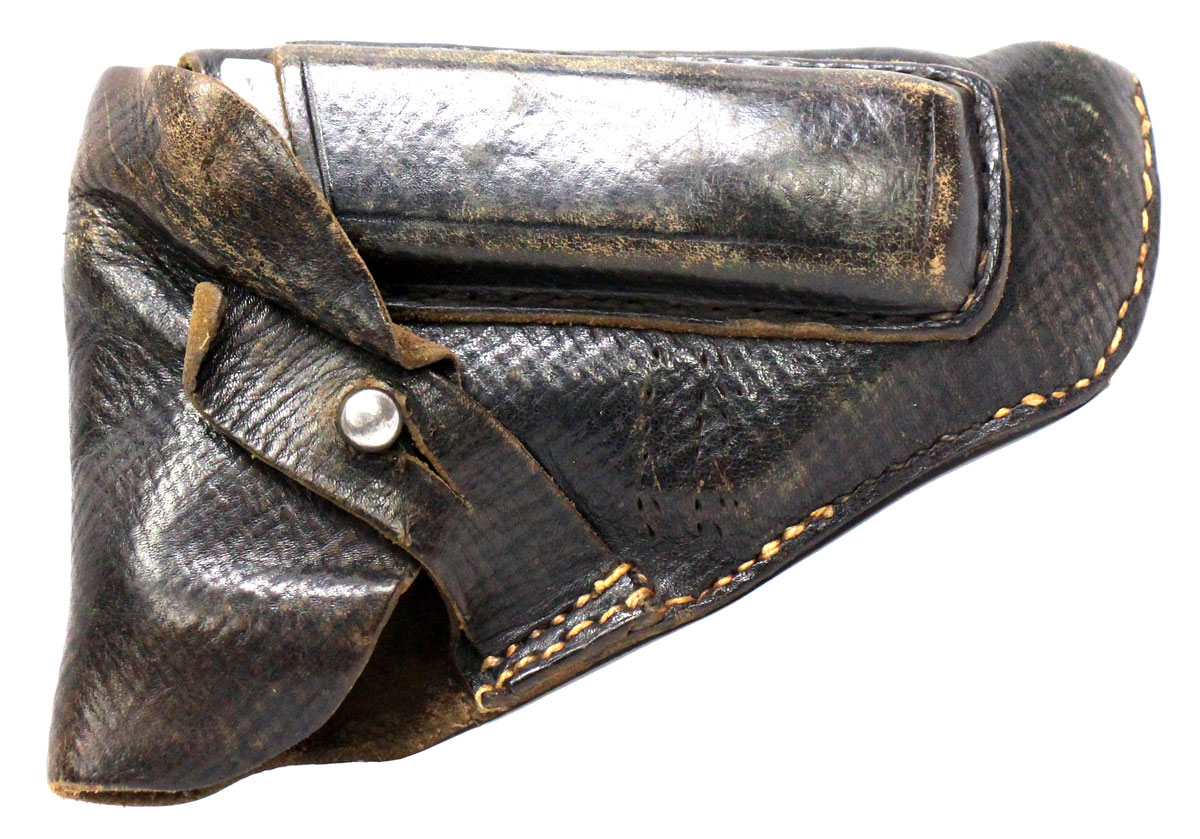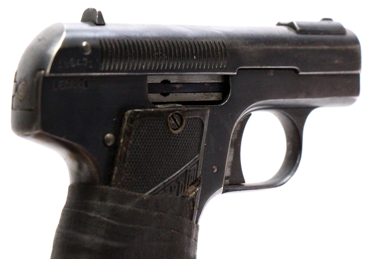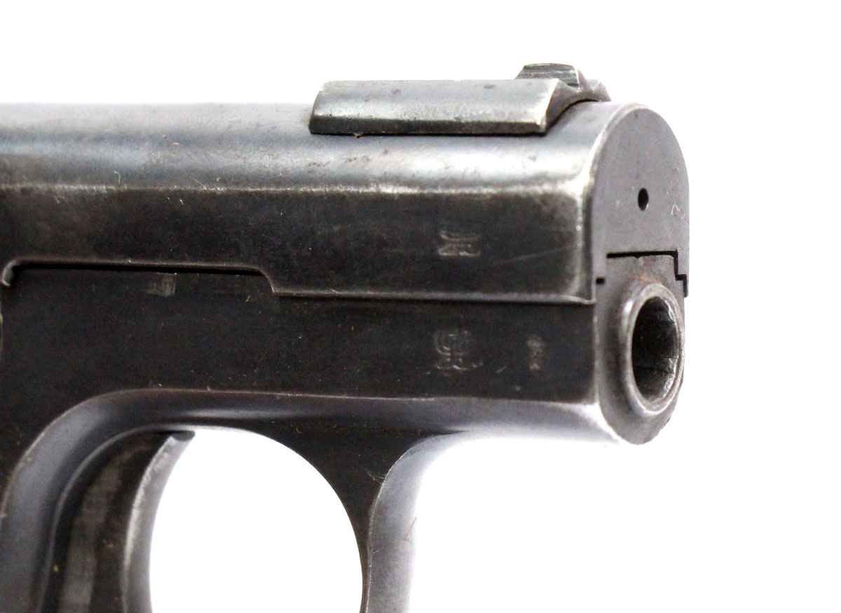 This is a WW1 Bayard 1908 pistol chambered in 32 ACP. It features a 2.25-inch barrel, 5-round magazine, fixed sights, heel magazine release, and manual thumb safety. Includes leather flap holster with spare magazine. Overall, this pistol is in good condition with normal age-related bluing wear on the slide and frame. The grips are in poor condition with multiple cracks, and are being held together with tape. The slide and frame have matching serial numbers and the frame features German WW1 imperial proofs. This would be a good choice for military surplus collectors. Buy online today!