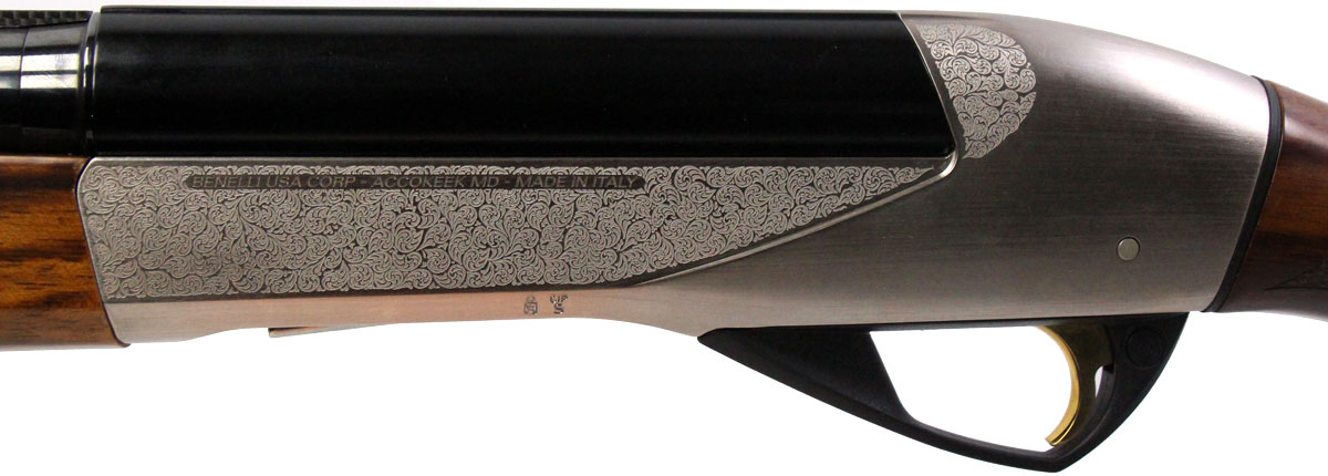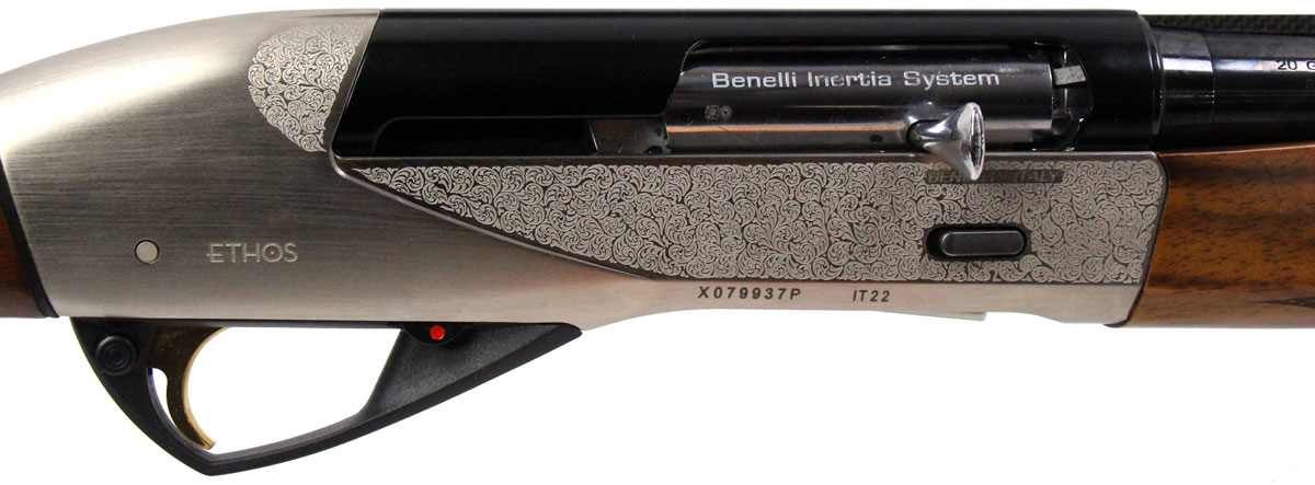 This is a used Benelli Ethos shotgun chambered in 20 gauge. It features a 28-inch vent rib barrel, 3-inch chamber, 14.25-inch length of pull, cross-bolt safety, screw-in improved modified choke, walnut furniture, and engraved nickel receiver. Includes factory case and a bottle of Benelli oil. Overall, this Benelli is in good condition with some handling wear on the stock. This would be a good choice for hunting. Buy online today!