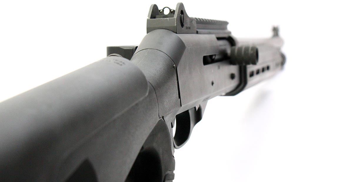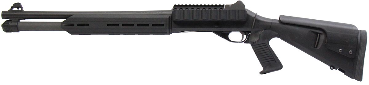 This is a used Benelli M4 shotgun chambered in 12 gauge. It features an 18.5-inch barrel, 3-inch chamber, screw-in modified choke, ghost ring sights, extended charging handle, M-LOK handguard, cheek riser, side saddle, and picatinny optic rail. Overall, this Benelli is in good condition with some handling wear on the barrel and receiver. This would be a good choice for home defense. Buy online today!