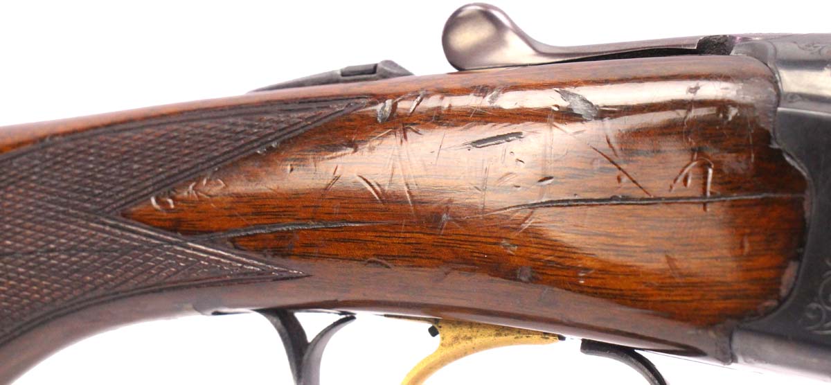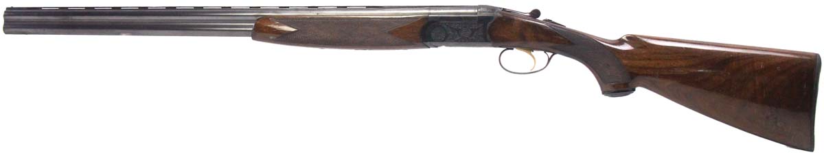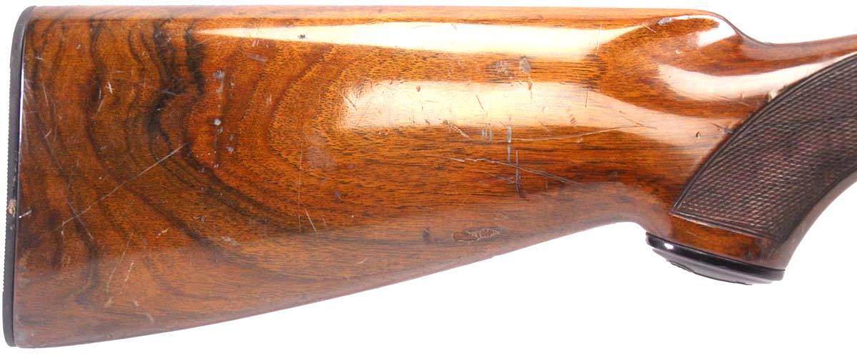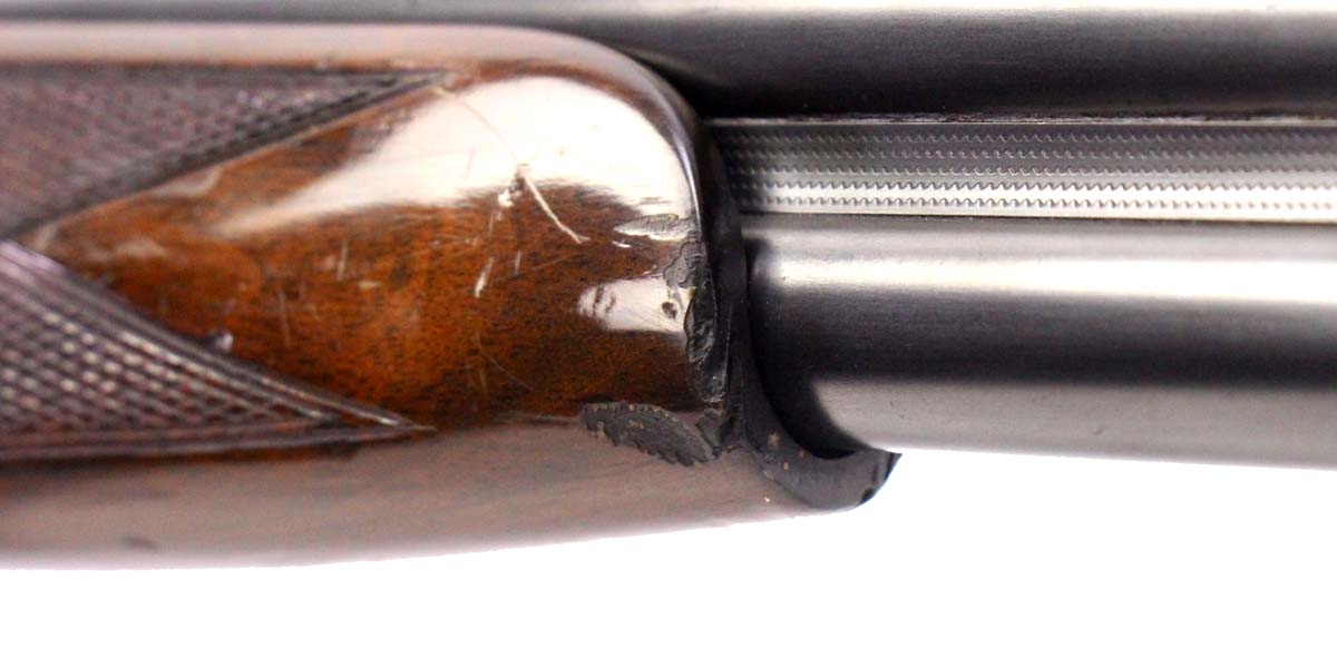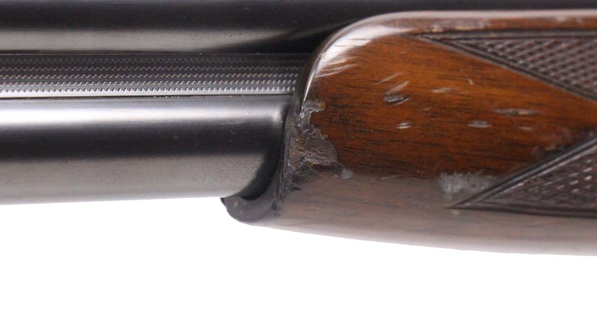 This is a used Beretta BL-3 shotgun chambered in 20 gauge. It features 26-inch barrels, 3-inch chambers, 14-inch length of pull, automatic safety, fixed modified choke, and fixed improved cylinder bore choke. Overall, this shotgun is in fair condition with some bluing wear on the barrels. The stock has many deep scratches, most notably throughout the wrist. This gun is being sold as-is.