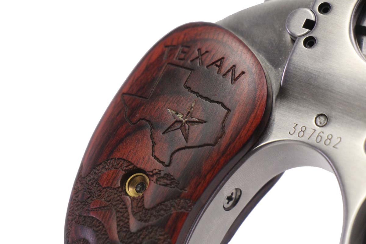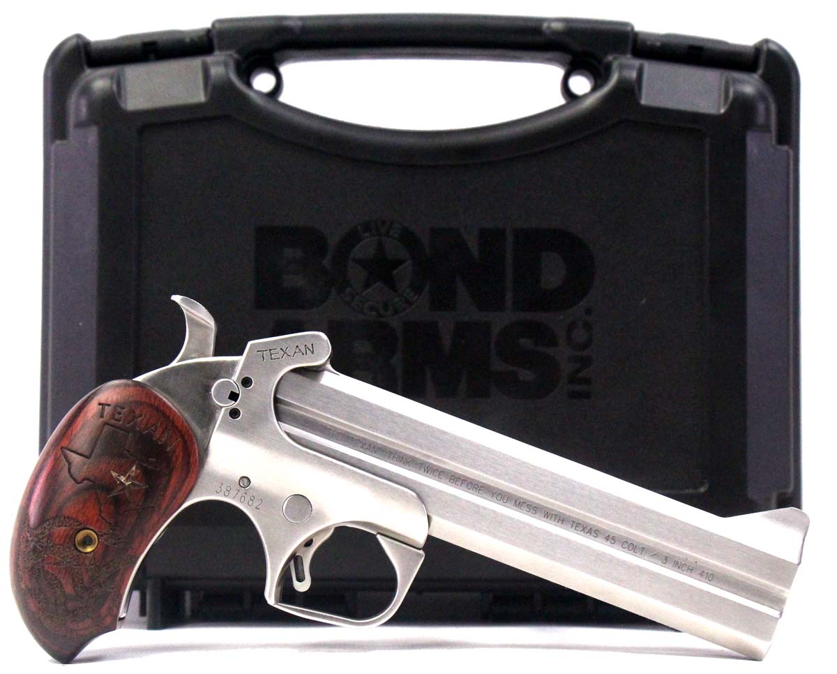 This is a used Bond Arms Texan Derringer pistol chambered in 45 Long Colt and 410 Bore. It features 6-inch barrels, 3-inch chambers, stainless finish, and rosewood grips. Includes factory box and manual. Overall, this pistol is in good condition with normal use wear on the frame. This would be a good choice for recreational target shooting. Buy online today!