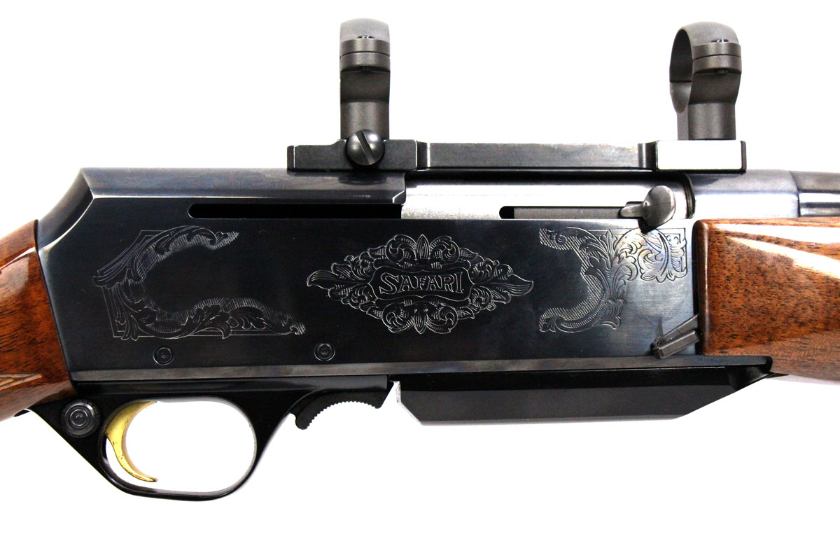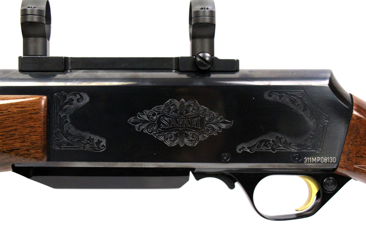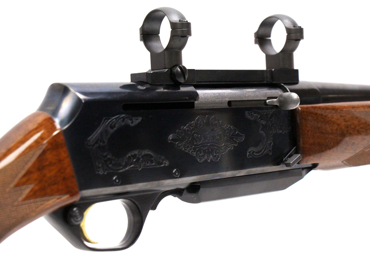 This is a used Browning BAR MKII Safari rifle chambered in 243 Winchester. It features a 22-inch barrel, 4-round magazine, 1-inch rings, sling studs, cross-bolt safety, walnut furniture, and engraved receiver. Overall, this rifle is in good condition with some handling wear on the stock. Bore condition is good with crisp rifling. Based on Browning's serial lookup, this rifle was manufactured in 2008. The barrel is marked "Made in Belgium Assembled in Portugal" on the left side. This would be good choice for hunting. Buy online today!