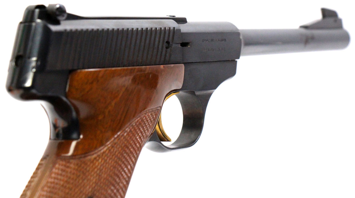 This is a vintage Browning Challenger pistol chambered in 22 Long Rifle. It features a 6.75-inch barrel, 10-round magazine, thumb safety, adjustable rear sight, wraparound wood grips, and blued finish. Includes Browning-branded leather case. Overall, this Browning is in good condition with some handling wear on the grips. Based on Browning's serial data, this pistol was manufactured in Belgium in 1970. This would be a good choice for target shooting. Buy online today!