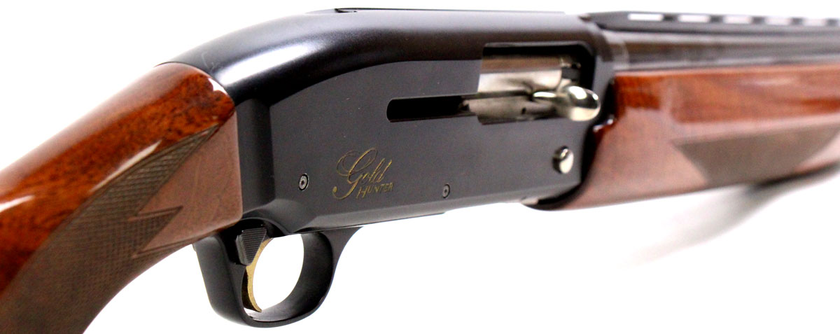 This is a used Browning Gold Hunter shotgun chambered in 12 gauge. It features a 28-inch vent rib barrel, 3-inch chamber, 14.75-inch length of pull, screw-in improved cylinder choke, cross-bolt safety, and blued finish. Overall, this Browning is in good condition with some handling wear on the receiver and stock. Based on Browning's serial datasheet, this shotgun was manufactured in 1996. The barrel is marked "Made in Belgium Assembled in Portugal" on the left side. This would be a good choice for hunting. Buy online today!