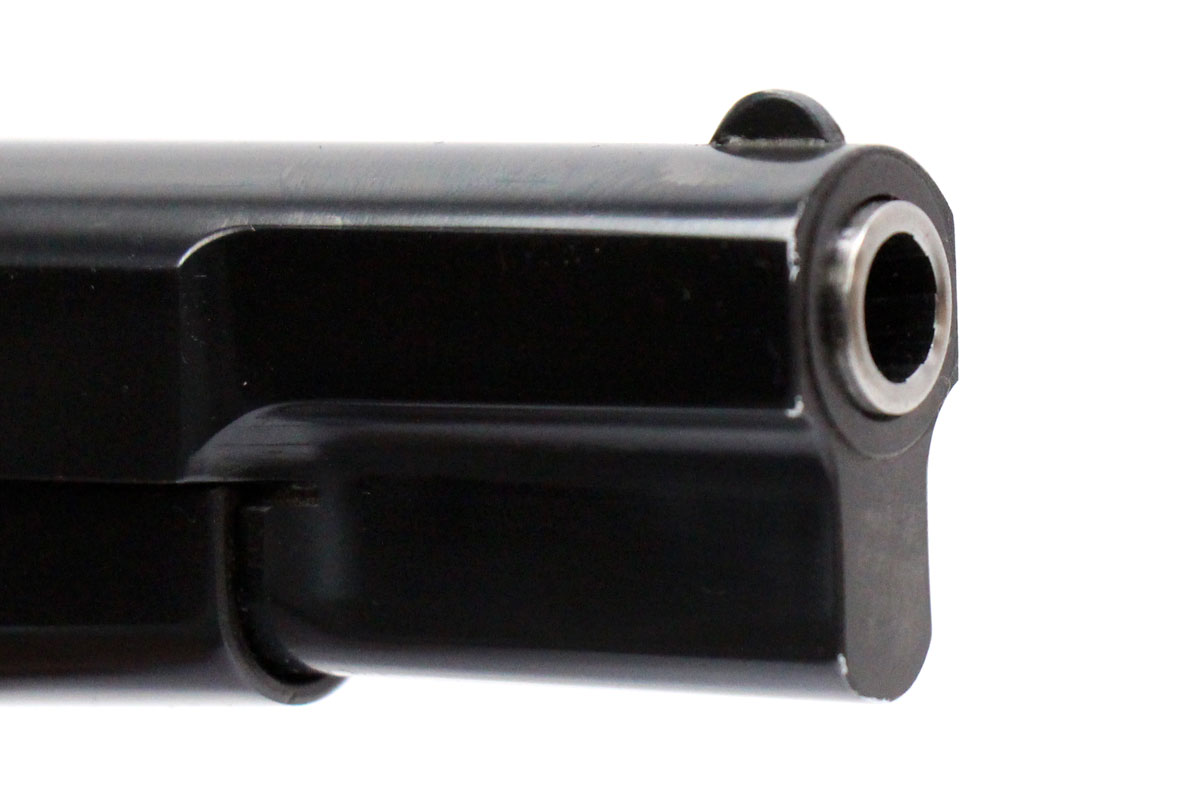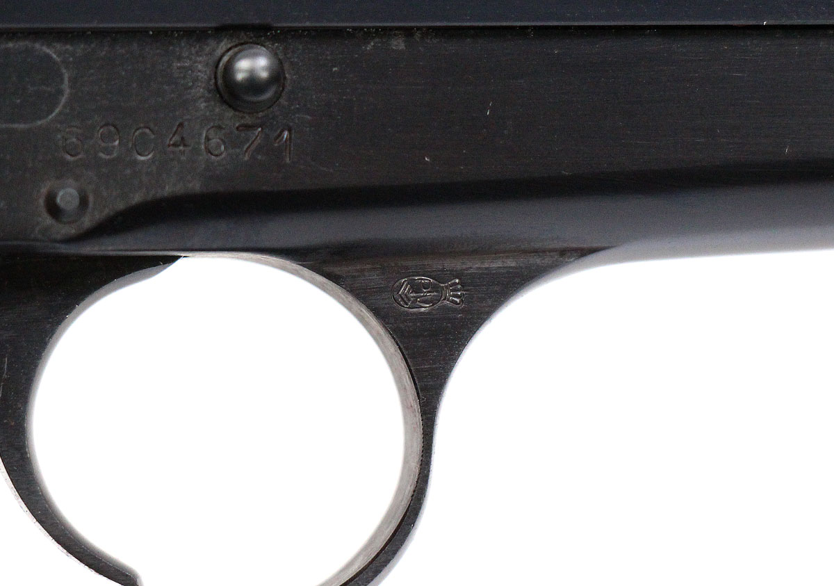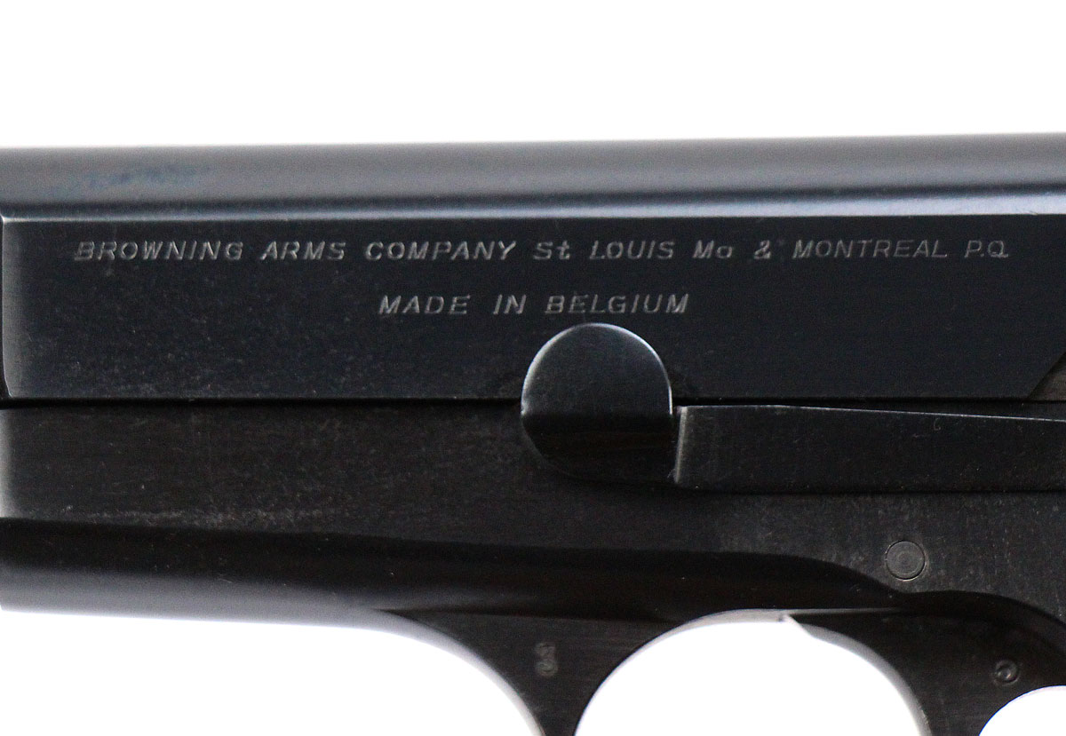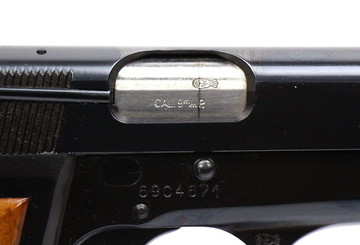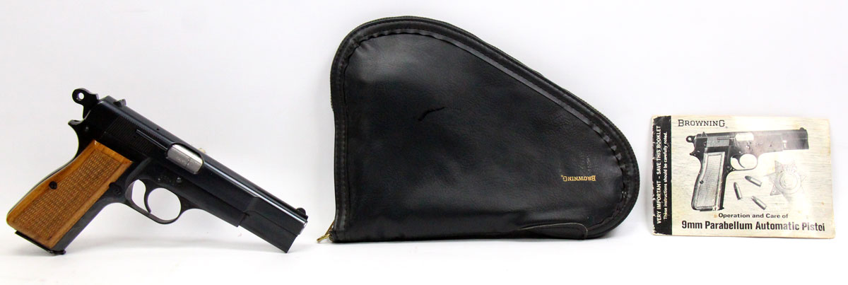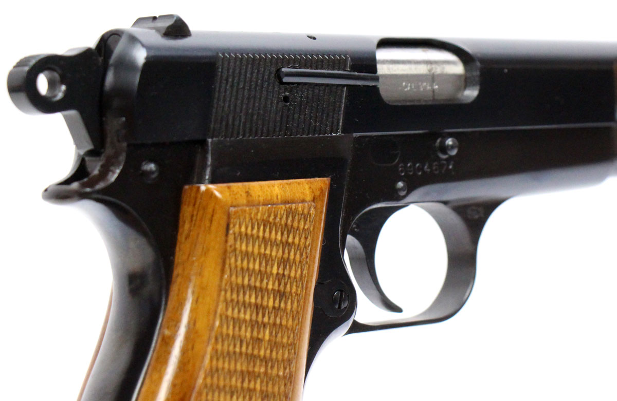 This is a vintage Browning Hi Power pistol chambered in 9mm. It features a 4.75-inch barrel, 13-round magazine, thumb safety, magazine disconnect safety, fixed sights, checkered wood grips, ring hammer, and blued finish. Includes Browning felt-lined leather case with manual. Overall, this Browning is in very good condition with minimal wear. Based on serial range, this pistol was manufactured in 1969. The slide is marked "Made in Belgium" on the left side. This would be a good choice for home defense or for collectors. Buy online today!