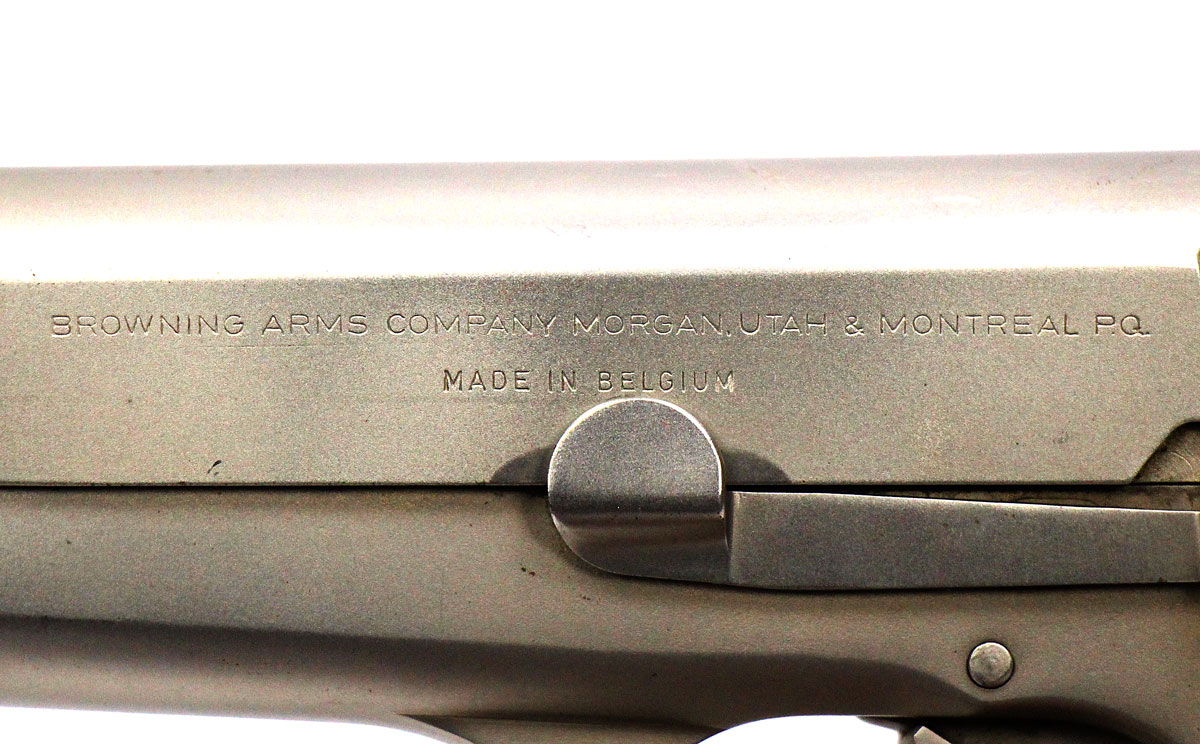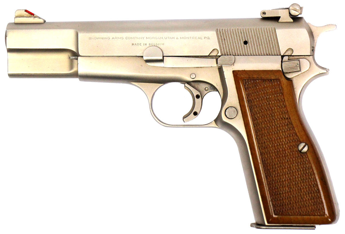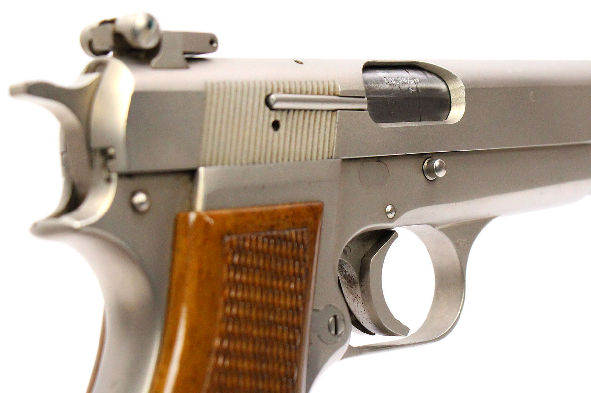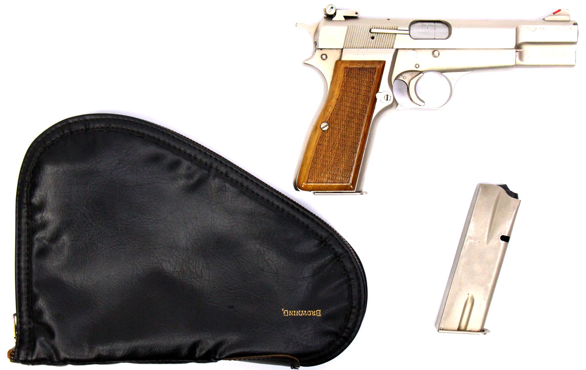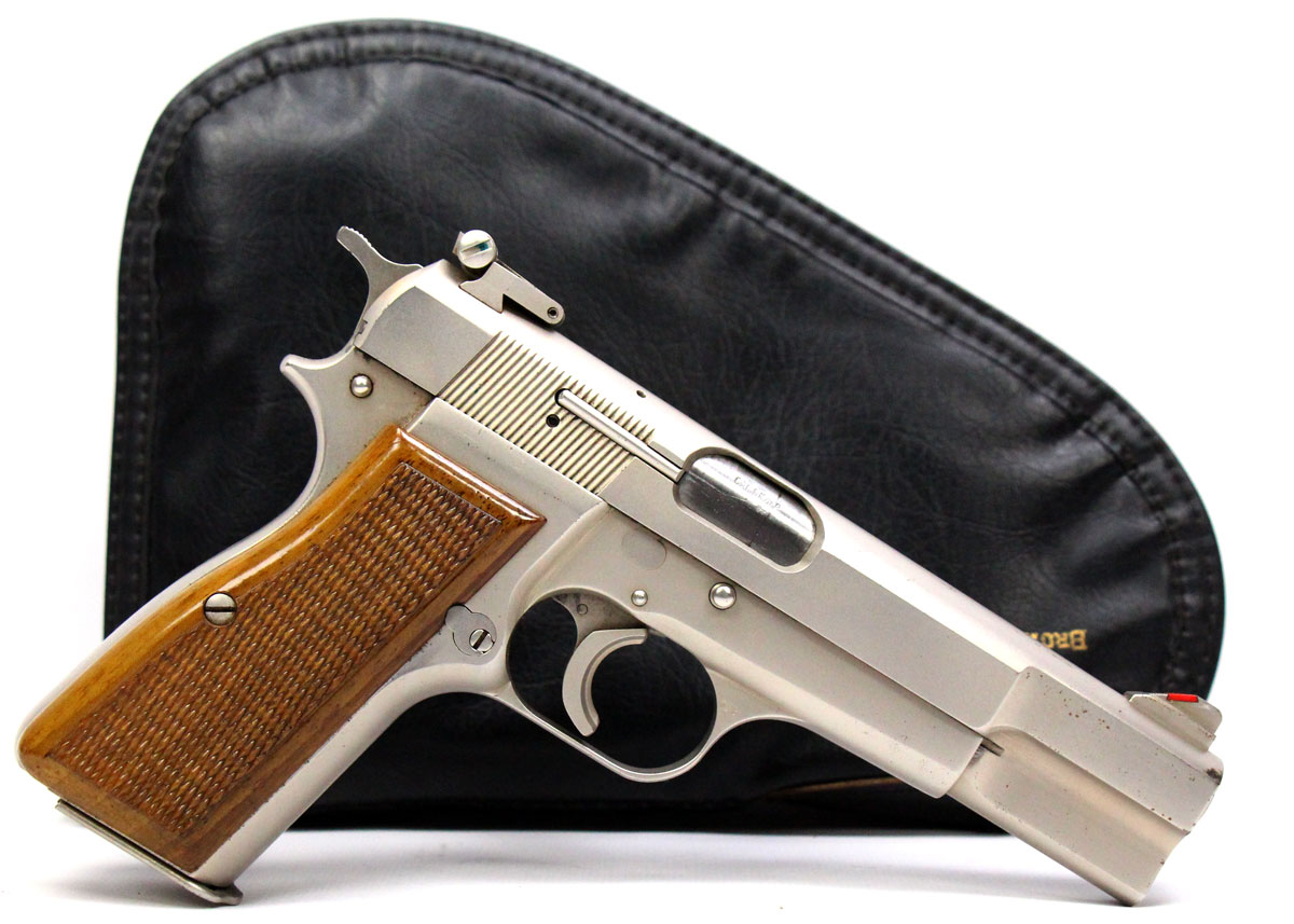 This is a used Browning Hi Power pistol chambered in 9mm. It features a 4.7-inch barrel, 13-round magazine, thumb safety, adjustable rear sight, red ramp front sight, spur hammer, trigger shoe, nickel finish, and wood grips. Includes Browning felt-lined leather case and two magazines. Overall, this Browning is in good condition with some corrosion on the right side of the slide toward the front sight. The backstrap is engraved with a previous owner's name. Based on serial range this pistol was manufactured in 1971. The slide is marked "Made in Belgium" on the left side. This would be a good choice for target shooting or collecting. Buy online today!