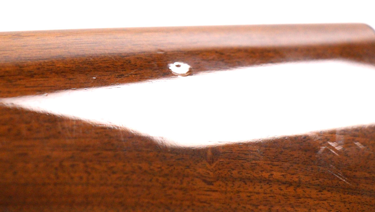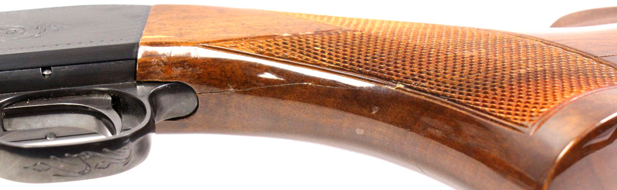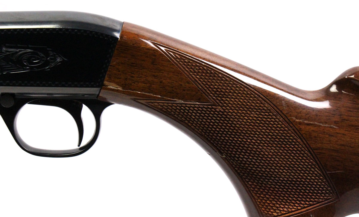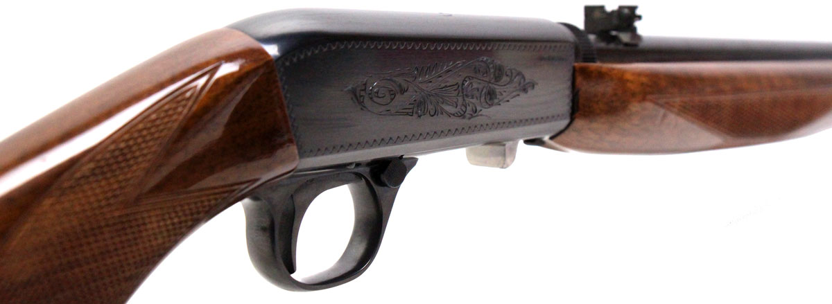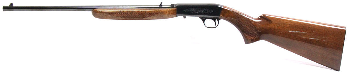 This is a used Browning SA-22 rifle chambered in 22 Long Rifle. It features a 19.25-inch barrel, 11-round tube magazine, adjustable rear sight, brass bead front sight, cross-bolt safety, tool-less takedown, blued finish, and factory engraved receiver. Overall, this Browning is in fair condition with some handling marks on the stock. The stock has a large crack in the wrist on the left side and near the trigger guard. Bore condition is good with crisp rifling. The barrel is marked "Made in Belgium". Based on Browning's serial data, this rifle was manufactured in 1972. This gun is being sold as-is.