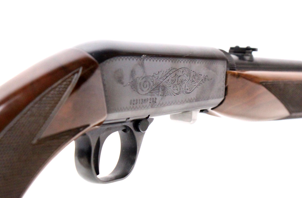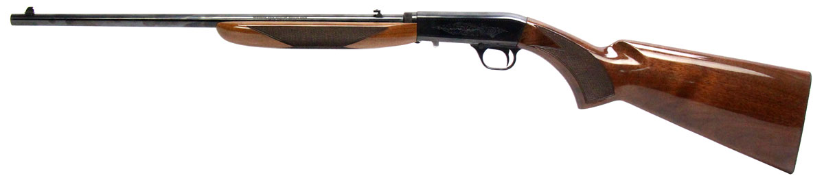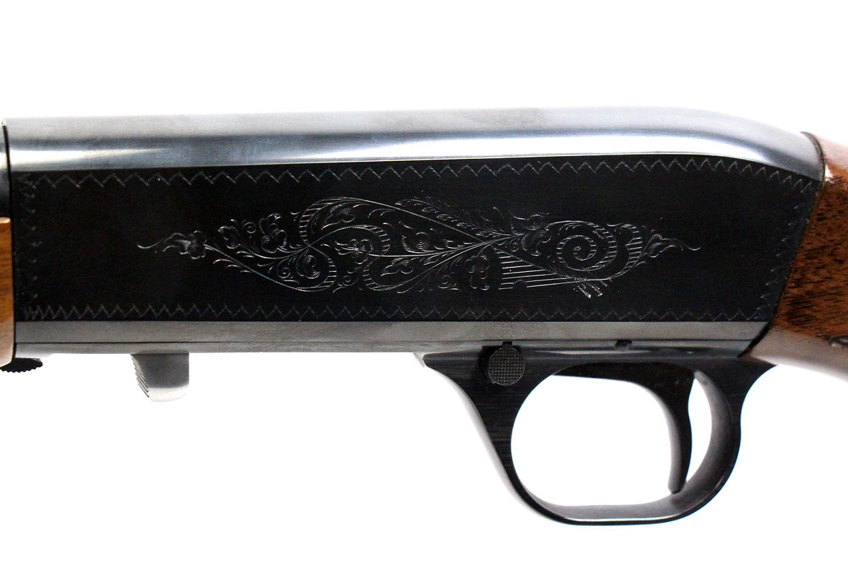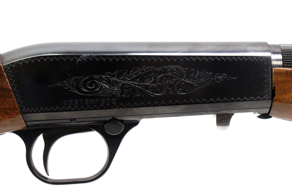 This is a used Browning SA-22 rifle chambered in 22 Long Rife. It features a 19.25-inch barrel, 11-round tube magazine, folding rear sight, brass bead front sight, cross-bolt safety, tool-less takedown, blued finish, and factory engraved receiver. Overall, this Browning is in good condition with some handling wear on the stock. Bore condition is good with crisp rifling. Based on Browning's serial lookup, this rifle was manufactured in 2008. The barrel is marked "Made in Japan" on the left side. This would be a good choice for target shooting or for hunting small game. Buy online today!
