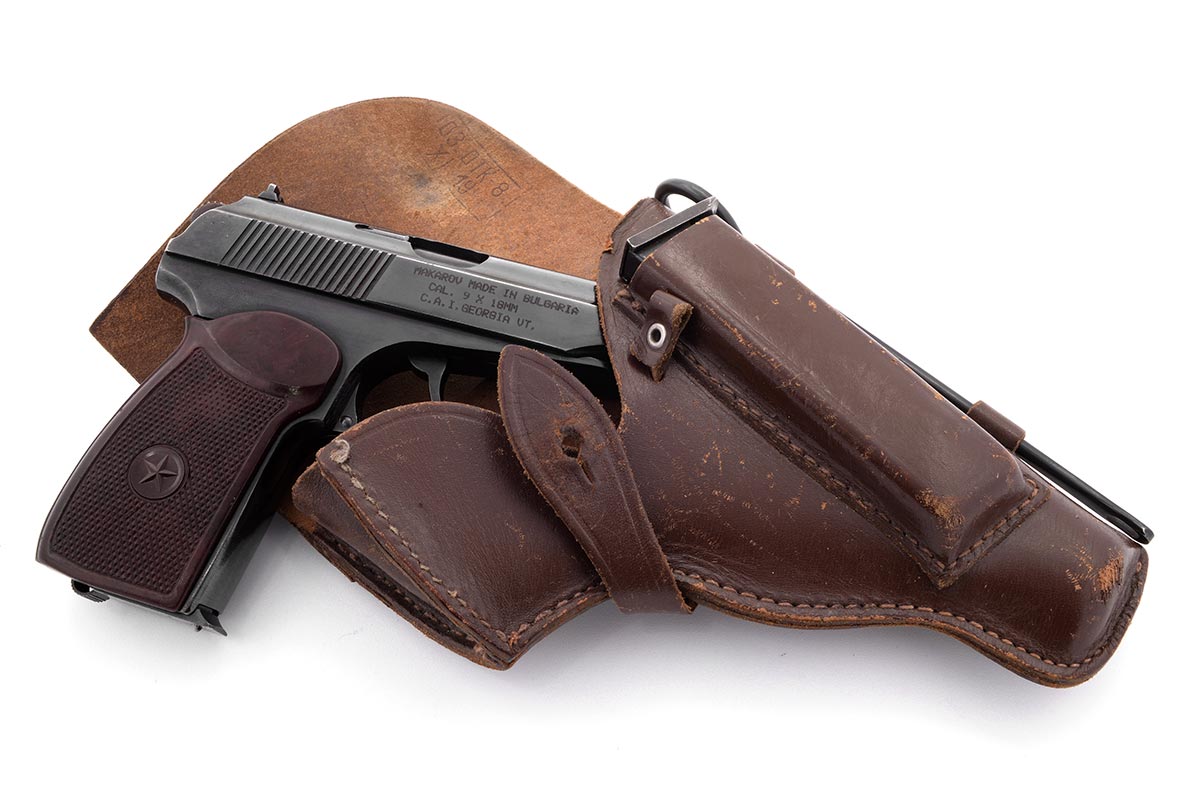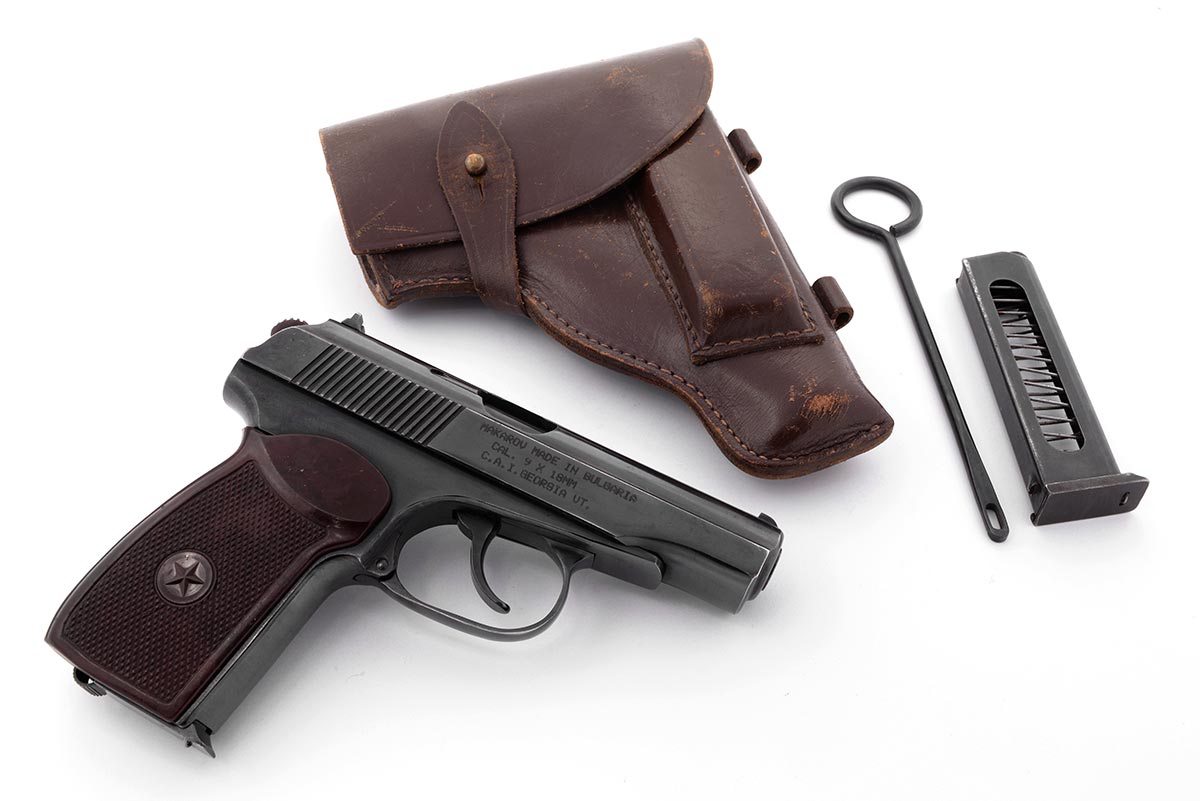 This is a vintage Bulgarian Arsenal (Circle 10) PM Makarov pistol chambered in 9x18 MAK. It features a 3.68-Inch barrel, blued finish, and bakelite grips. The serial number indicates this pistol was manufactured in 1987. Included is a Russian military surplus holster with cleaning rod and extra magazine. Overall condition is good with an excellent bore, and some minor wear and spotting of patina to the finish. The holster is in fair condition with lots of scuffs and wear to leather, but the stitching is all intact. This would make a great addition to any European Cold War military firearm collection. Buy online today!