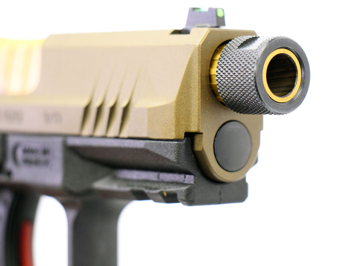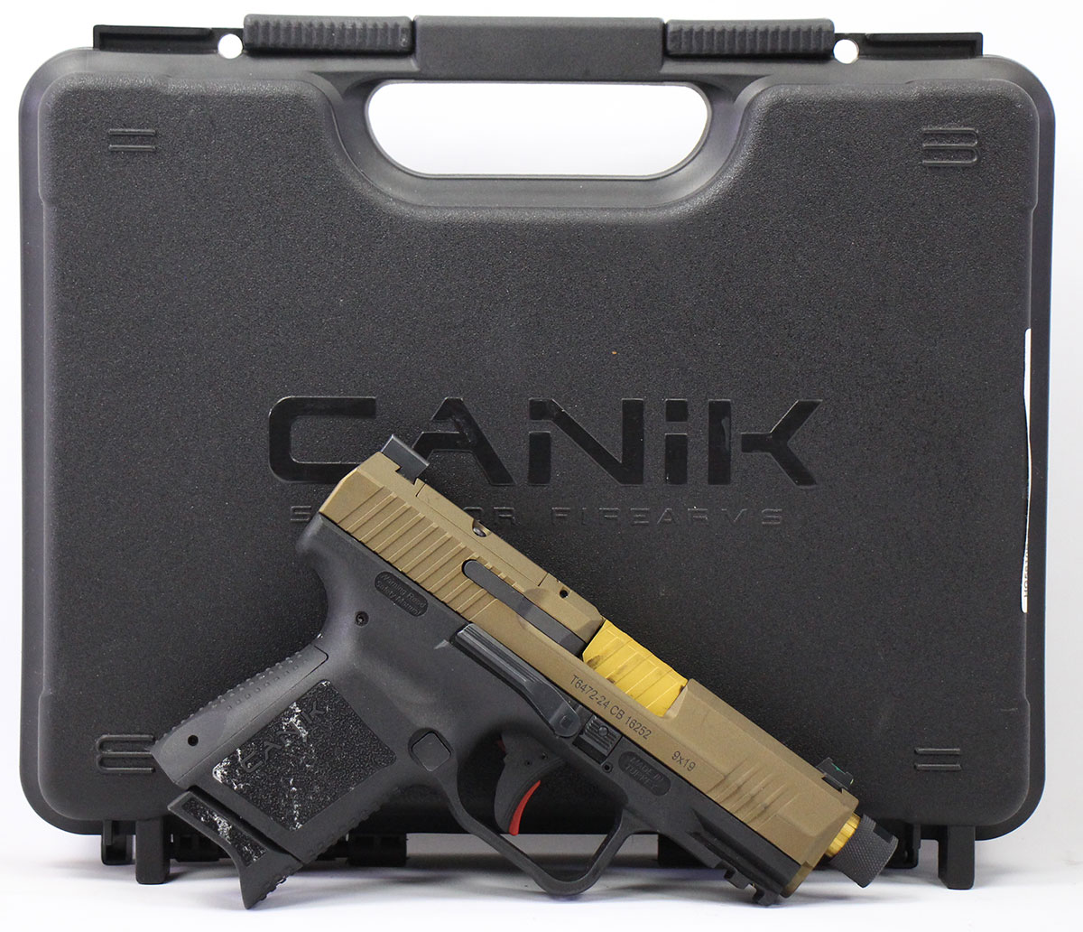 This is a used Canik TP9 Elite Subcompact pistol chambered in 9mm. It features a 4-inch threaded barrel, 12-round magazine, fiber optic front sight, black serrated rear sight, optics ready slide, and accessory rail. Includes factory box, instruction manual, cleaning brush, one 12-round magazine, and one 15-round magazine. Overall, this Canik is in good condition with normal use wear on the slide and barrel. This would be a good choice for concealed carry. Buy online today!