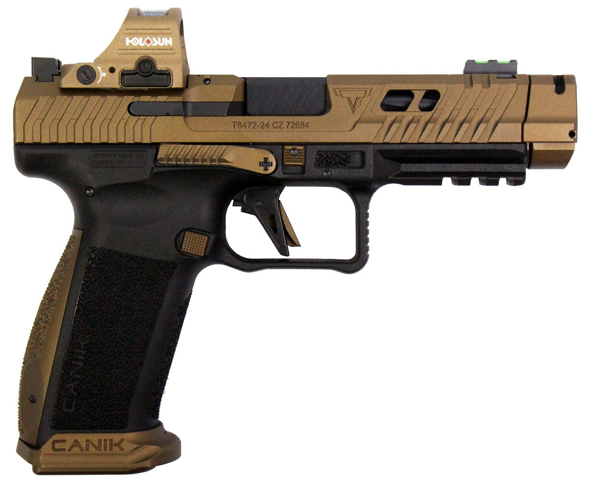 This is a used Canik TTI Combat pistol chambered in 9mm. It features a 4.6-inch fluted barrel with compensator, 10-round magazines, fiber optic front sight, flared magwell, accessory rail, burnt bronze Cerakote finish, and Holosun HS507C-X2 red dot sight. Includes factory box, two 10-round magazines, cleaning brush, two backstraps, challenge coin, magazine loading tool, and right-handed Kydex belt holster. Overall, this pistol is in good condition with normal use wear on the slide and barrel. This would be a good choice for target shooting. Buy online today!