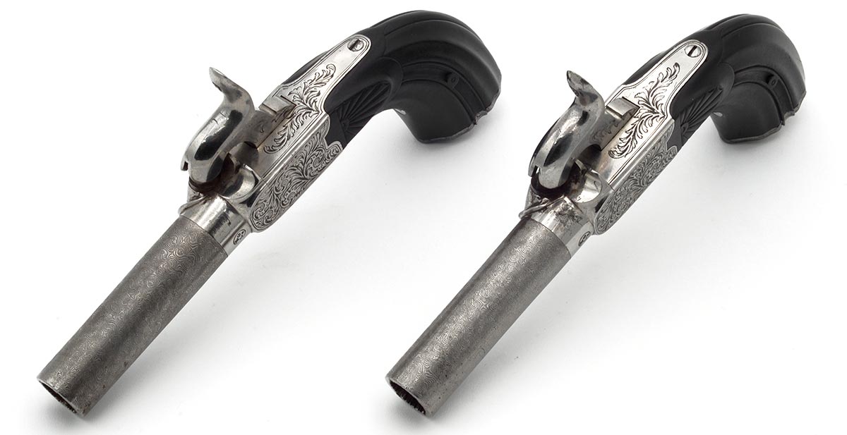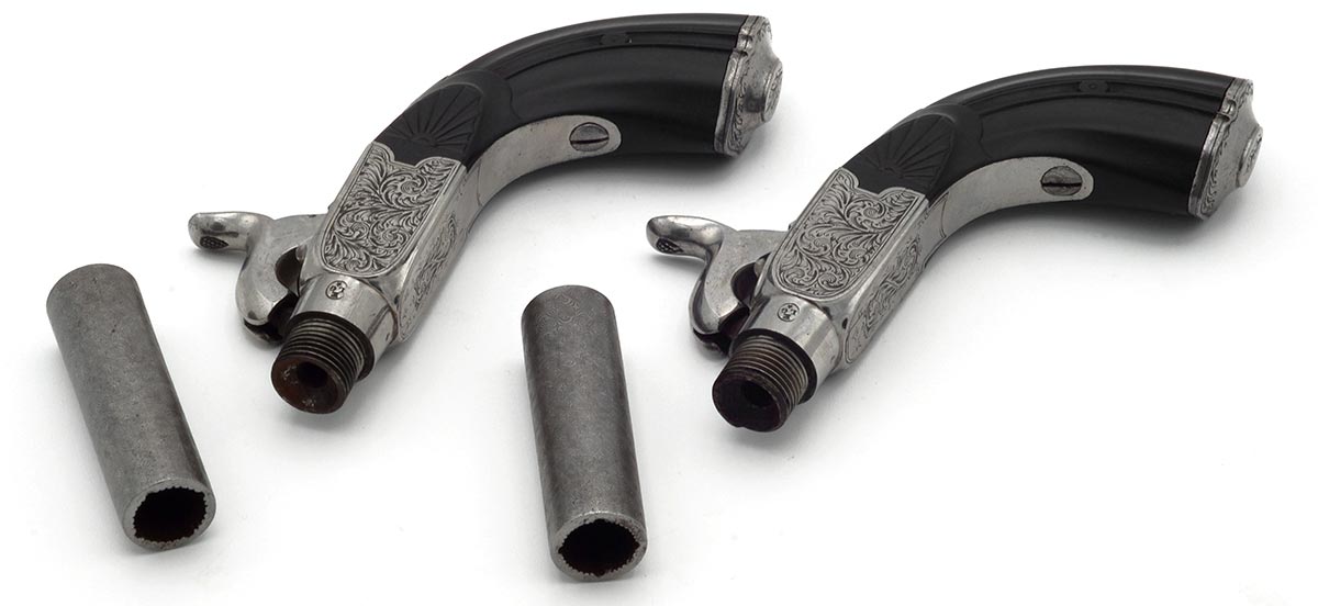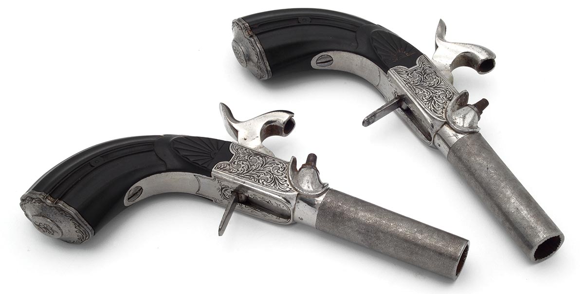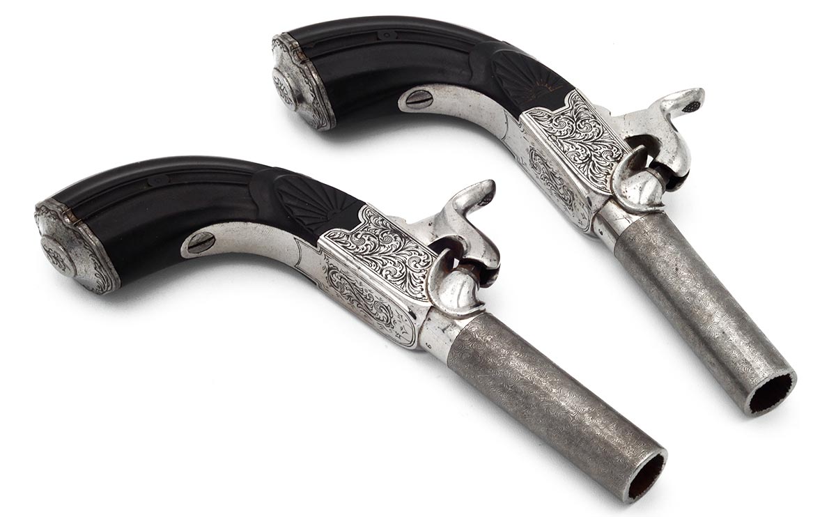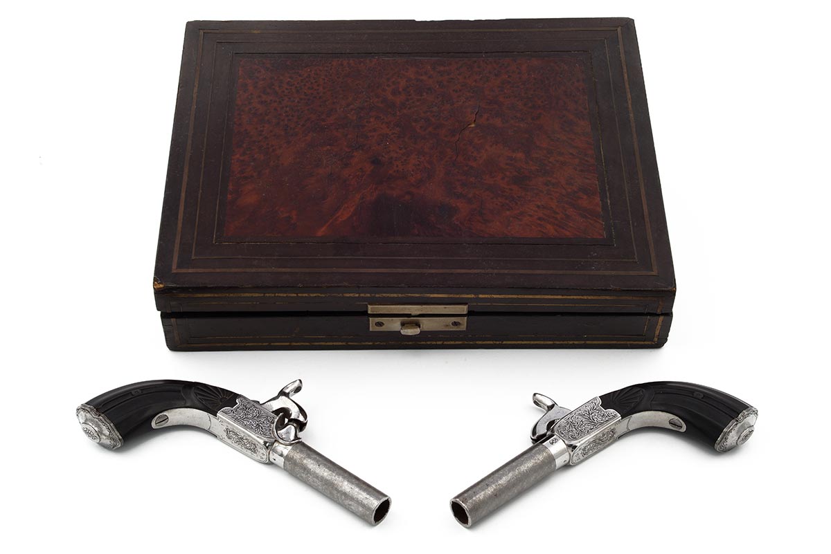 - Belgian Engraved Muff/Boot Percussion 44 Caliber Pistols Cased Pair - Antique Pistols *ca. 1850*