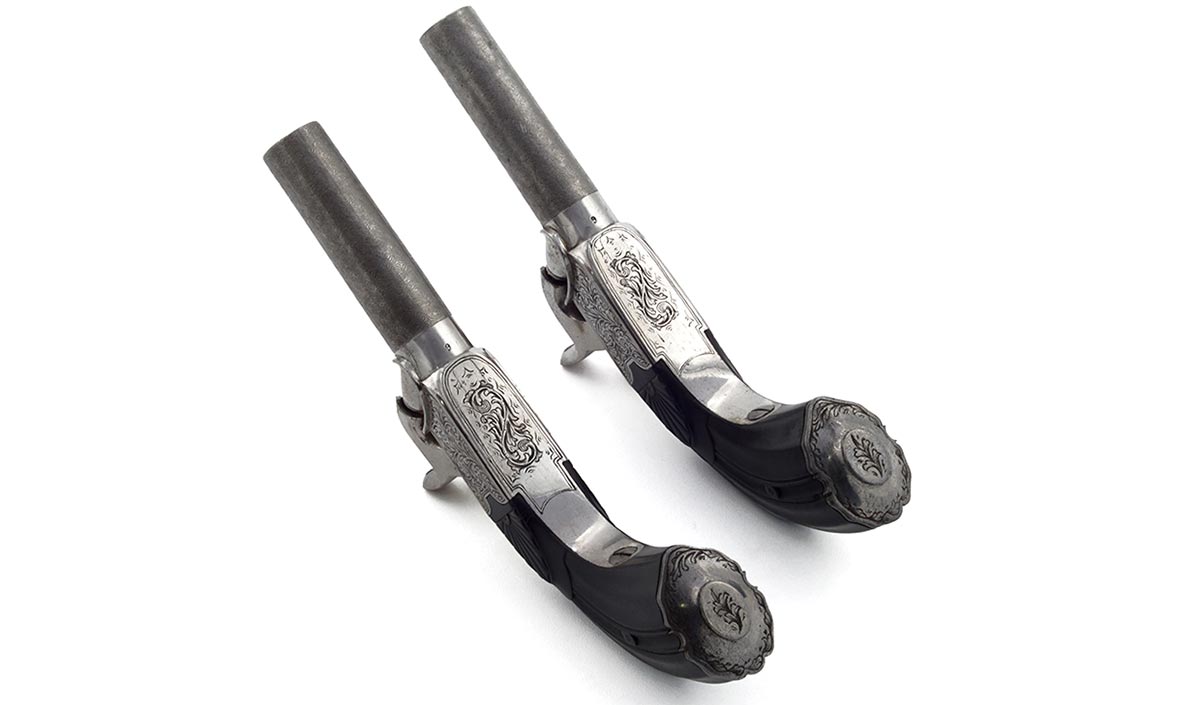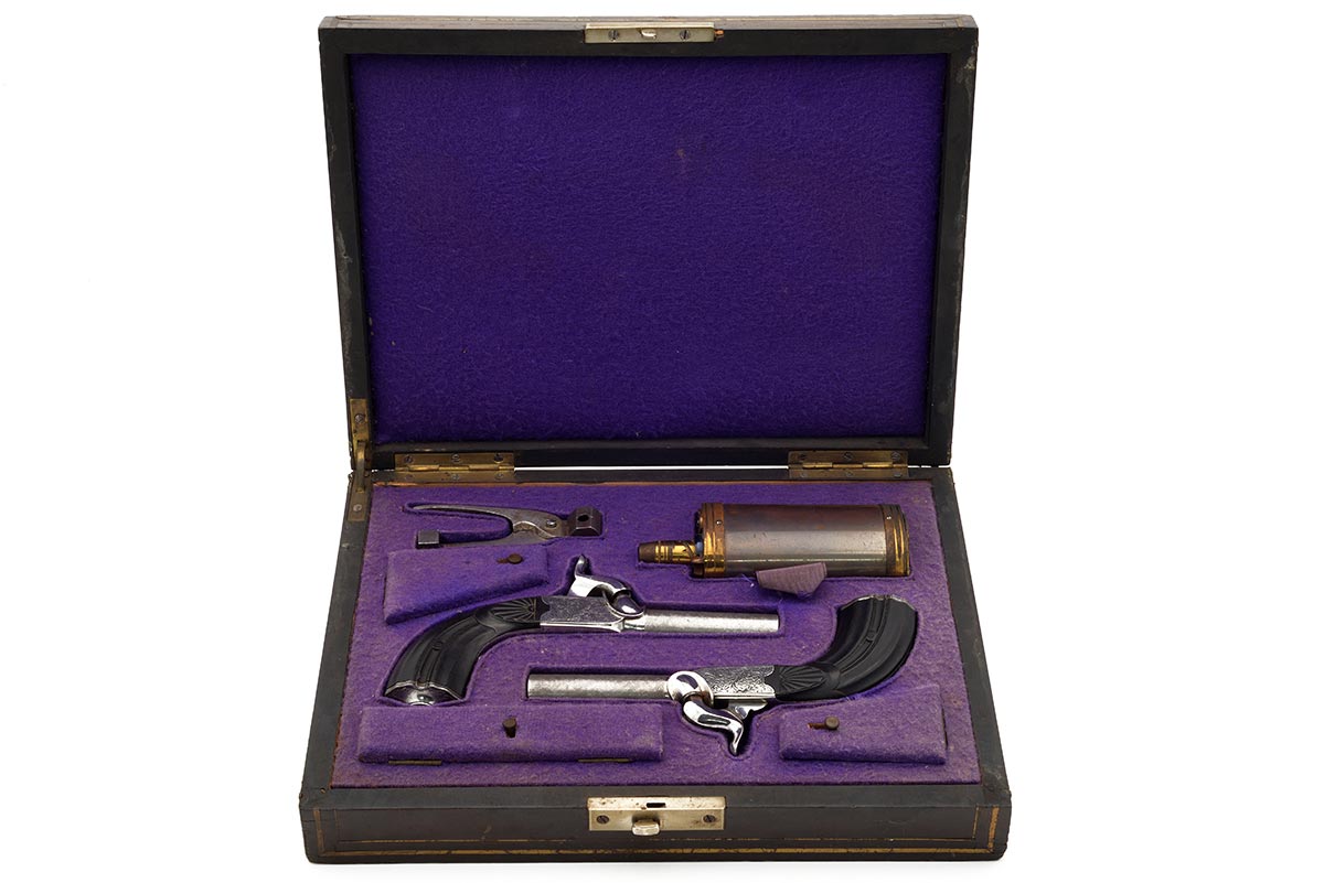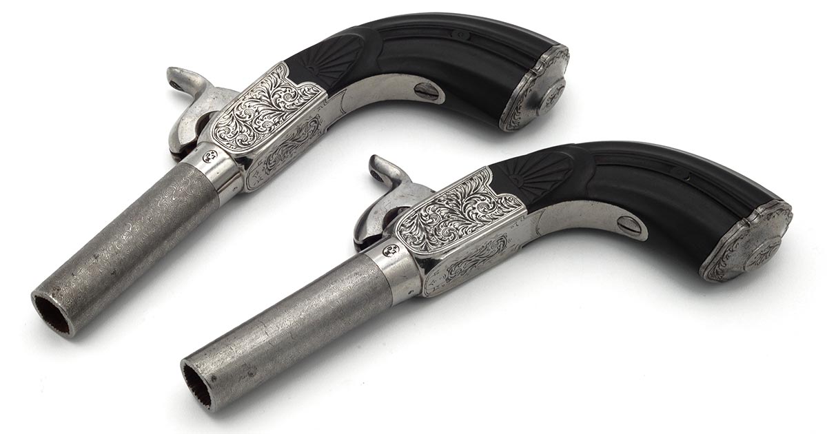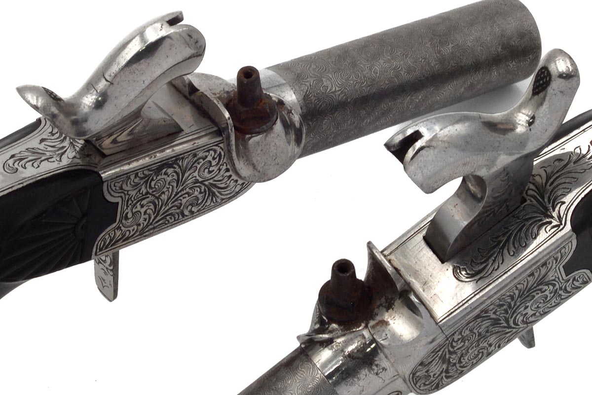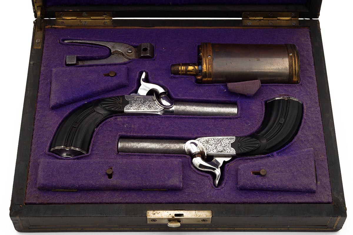 - Belgian Engraved Muff/Boot Percussion 44 Caliber Pistols Cased Pair - Antique Pistols *ca. 1850*