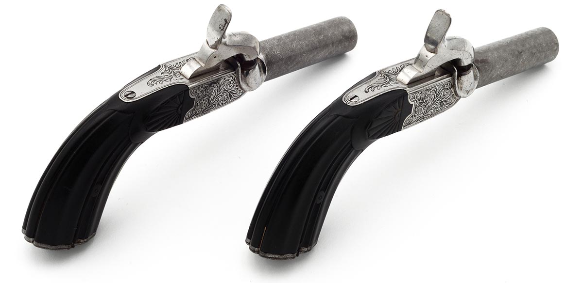 Belgian Engraved Muff/Boot Percussion 44 Caliber Pistols Cased Pair - Antique Pistols *ca. 1850*