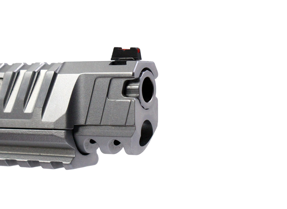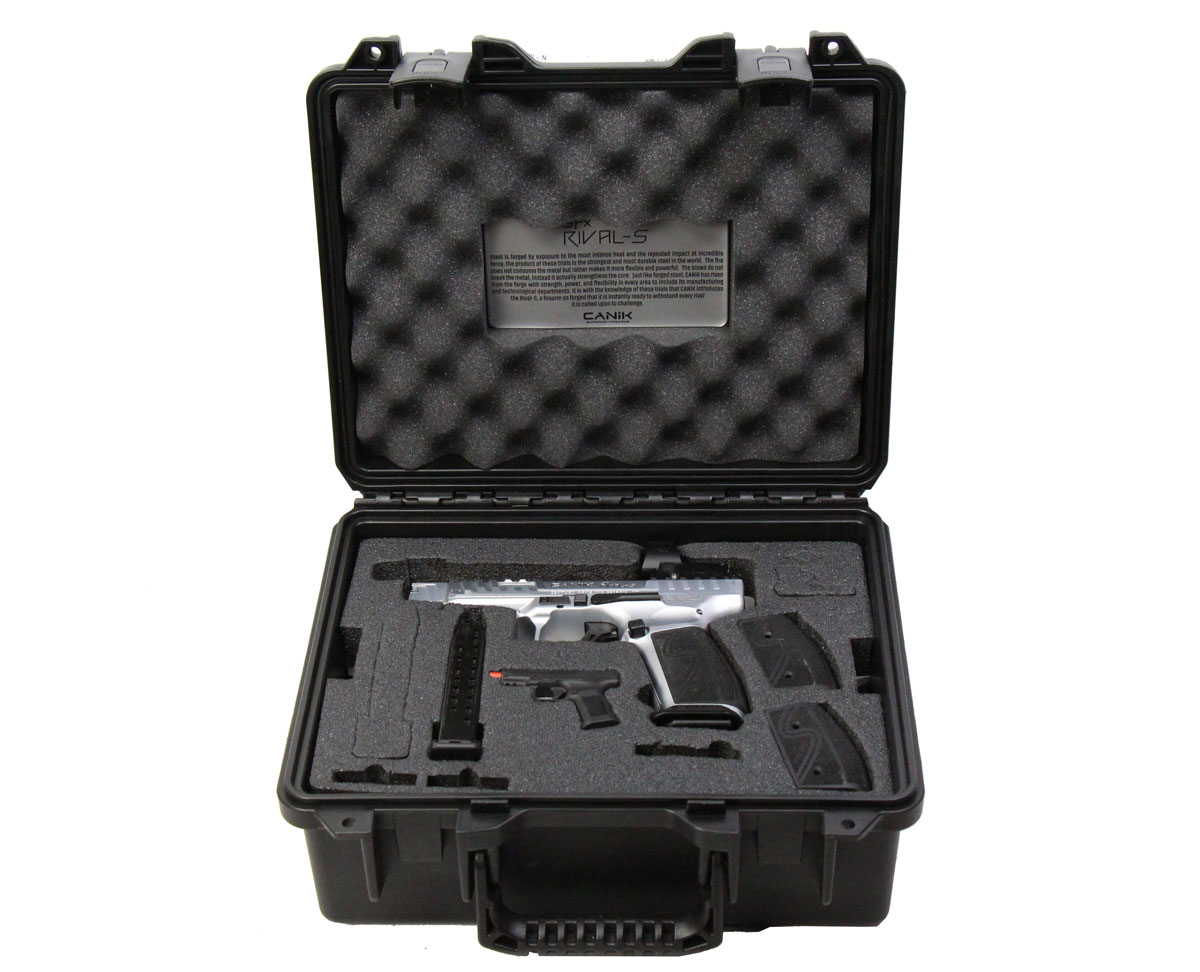 This is a used Century Arms Canik SFx Rival S pistol chambered in 9mm. It features a 5-inch barrel, 18-round magazines, fiber optic front sight, Mecanik red dot sight, flat trigger, Cerakoted steel frame, and accessory rail. Includes factory box, instruction manual, optic adaptor plate set, cleaning kit, holster, magazine loading tool, and two magazines. Overall, this Canik is in very good condition with minimal wear. This would be a great choice for target shooting. Buy online today!