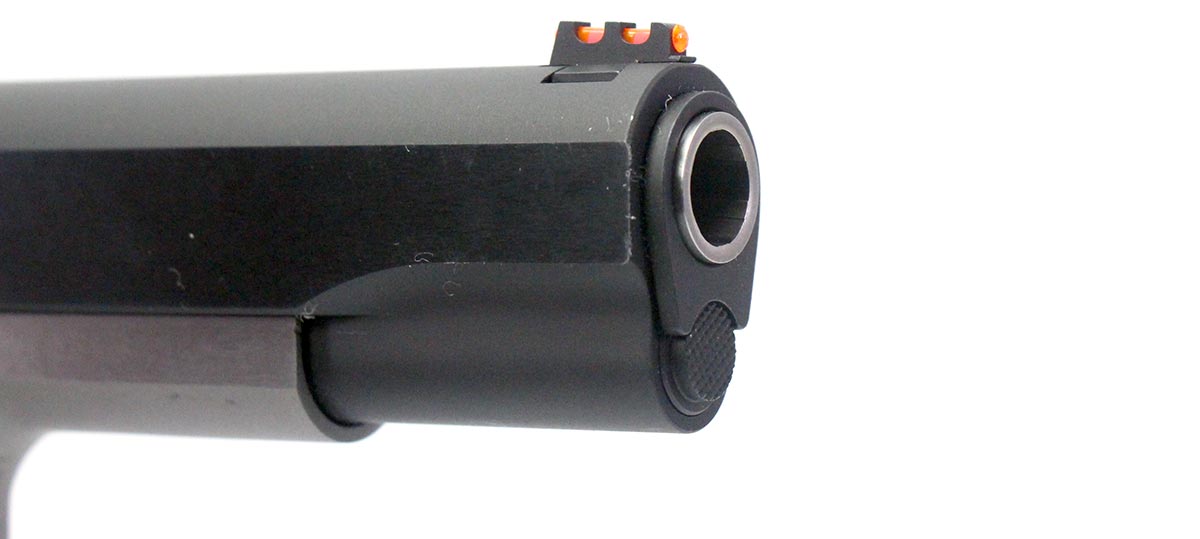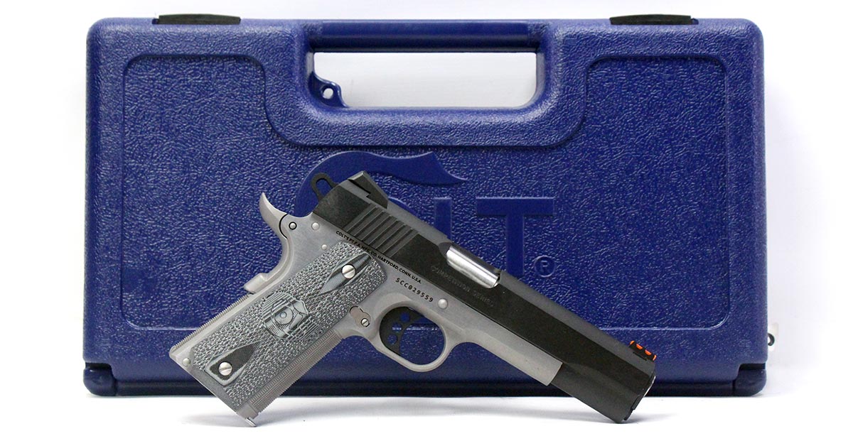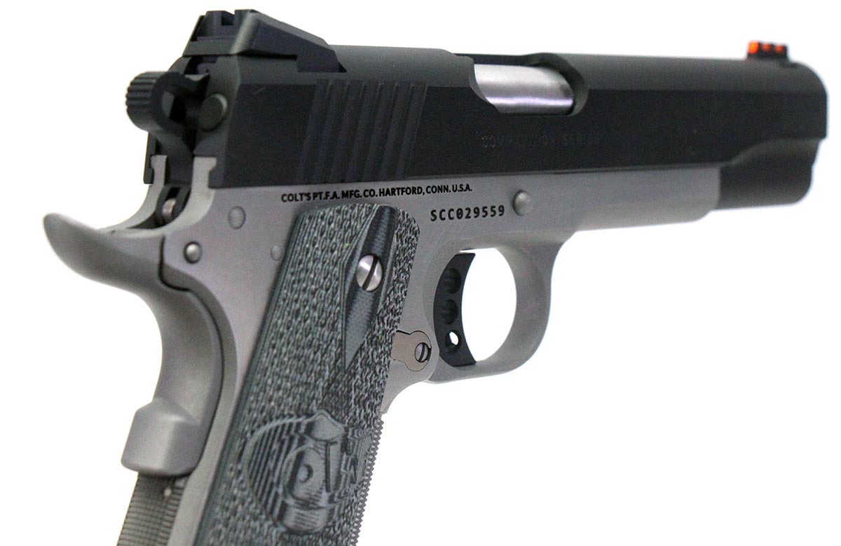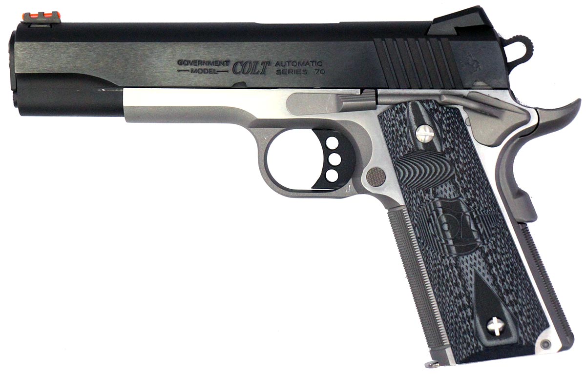 This is a used Colt 1911 Competition Series Two Tone pistol chambered in 45 ACP. It features a 5-inch barrel, 8-round magazines, fiber optic front sight, thumb safety, grip safety, stainless frame, blued slide, G10 grips, and series 70 firing pin system. Includes factory box, manual, and two magazines. Overall, this pistol is in very good condition with minimal wear. This would be a great choice for target shooting. Buy online today!