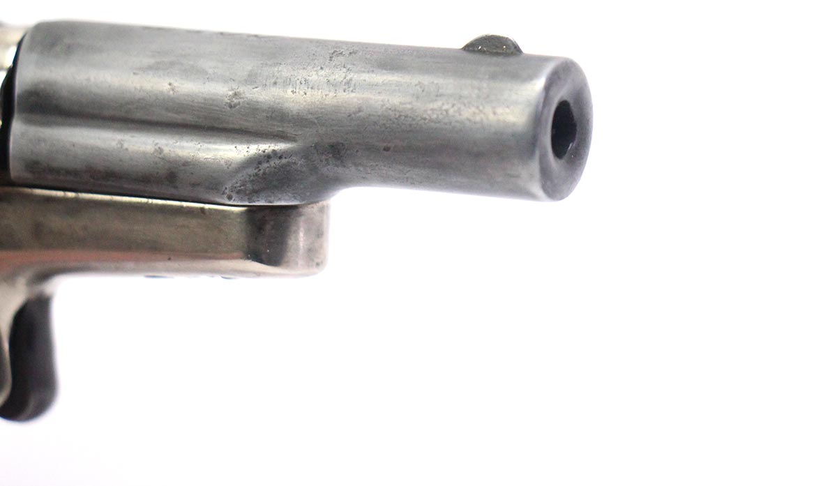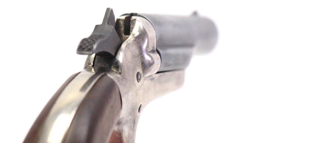 This is a used Colt 4th Model Derringer pistol chambered in 22 Short. It features a 2.5-inch barrel, nickel plated frame, and wood grips. Overall, this pistol is in good condition with significant finish wear and pitting throughout the barrel exterior. This would be a good choice for concealed carry. Buy online today!