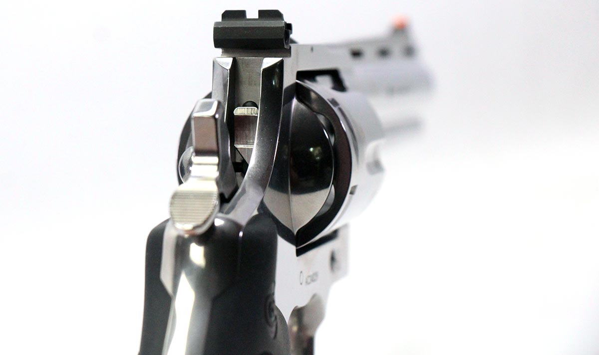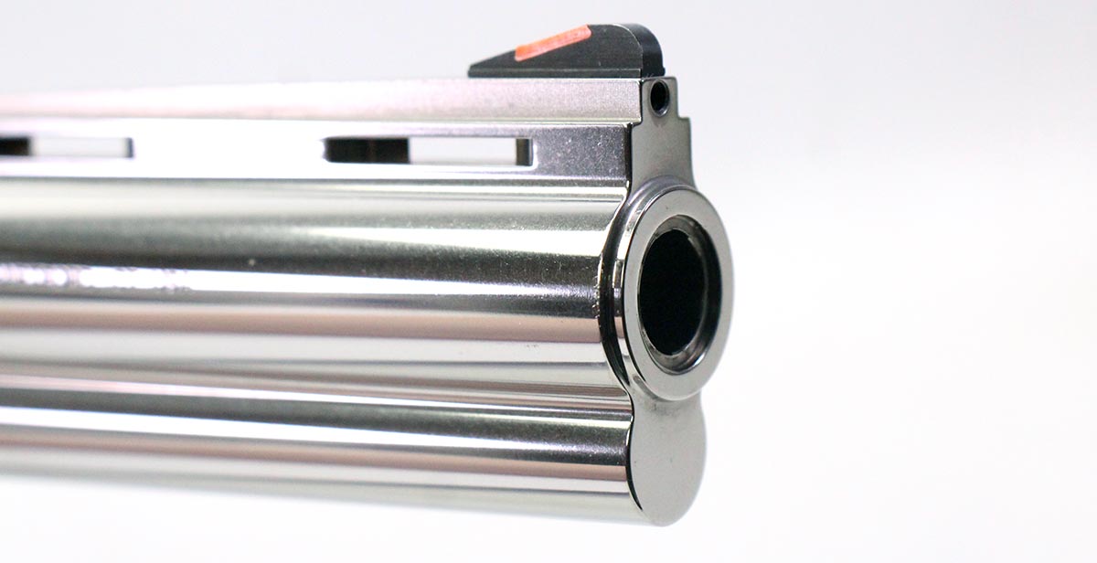 This is a used new-model Colt Anaconda revolver chambered in 44 Magnum. It features a 6-inch barrel with recessed target crown, ventilated rib, 6-round cylinder, adjustable rear sight, red ramp front sight, factory drilled and tapped frame, stainless finish, and rubber grips. Includes factory box and manual. Overall, this Colt is in good condition with normal use cylinder turn lines and some handling wear on the frame. This would be a good choice for target shooting or hunting. Buy online today!