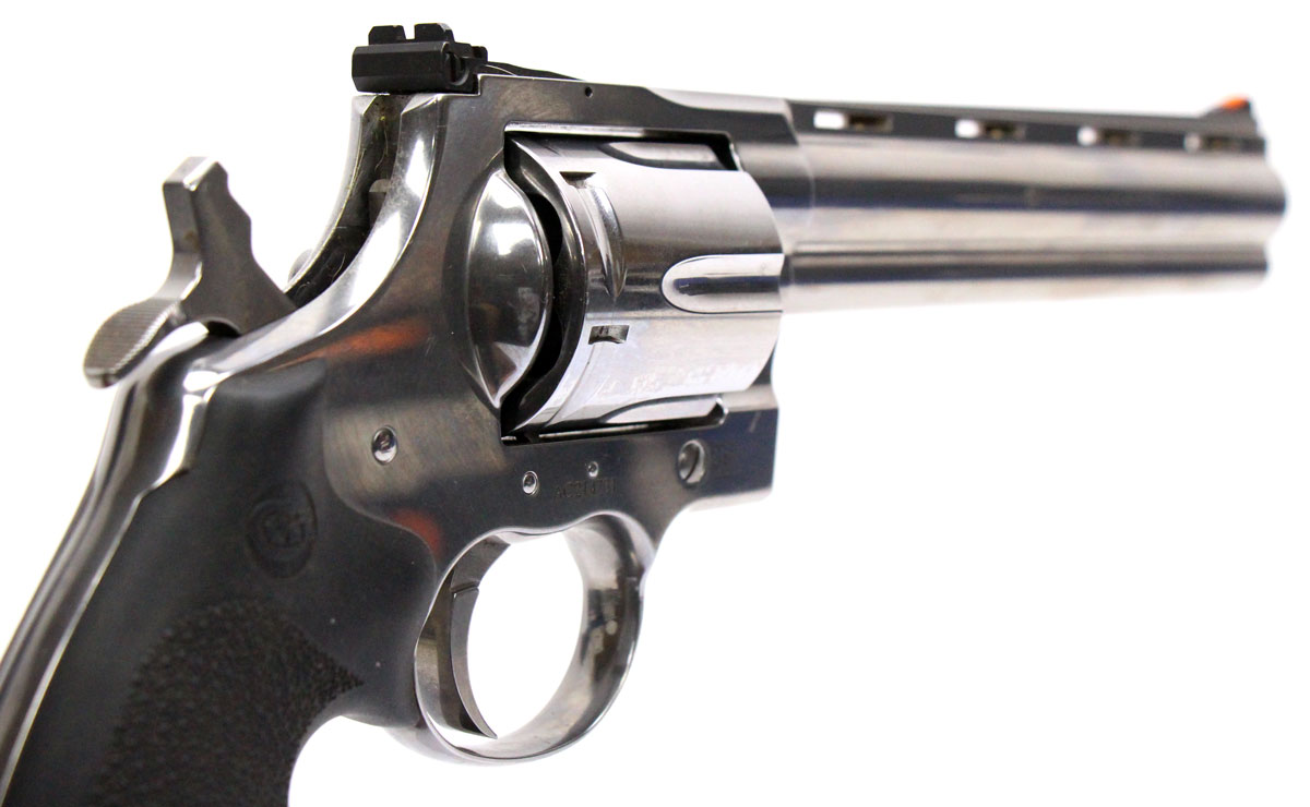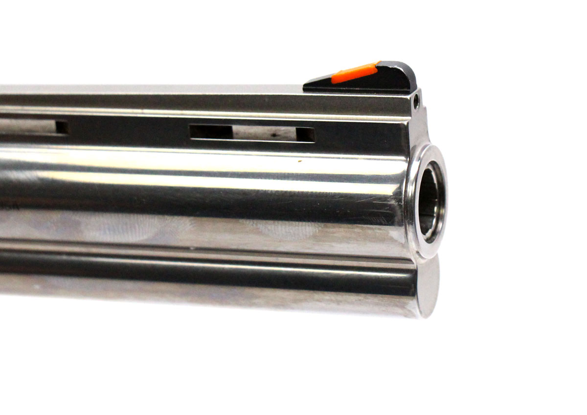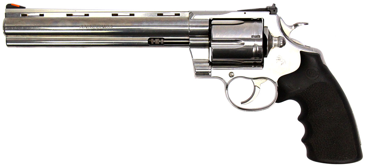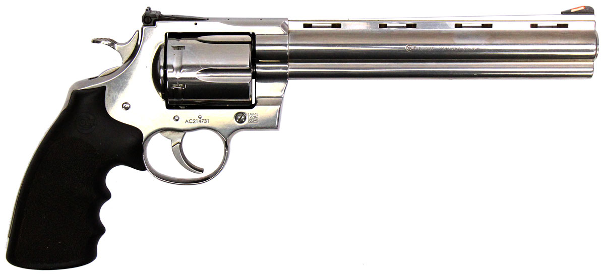 This is a used Colt Anaconda revolver chambered in 44 Magnum. It features an 8-inch barrel with recessed target crown, ventilated rib, 6-round cylinder, adjustable rear sight, red ramp front sight, factory drilled and tapped frame, stainless finish, and rubber grips. Includes factory box and manual. Overall, this Colt is in good condition with normal use cylinder turn lines and some handling wear on the frame. This would be a good choice for target shooting or hunting. Buy online today!