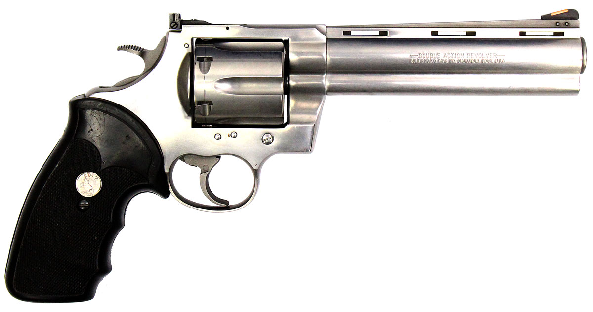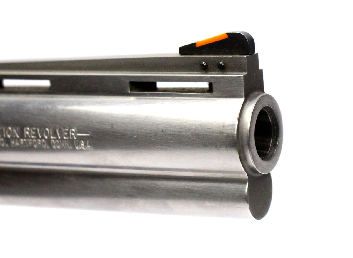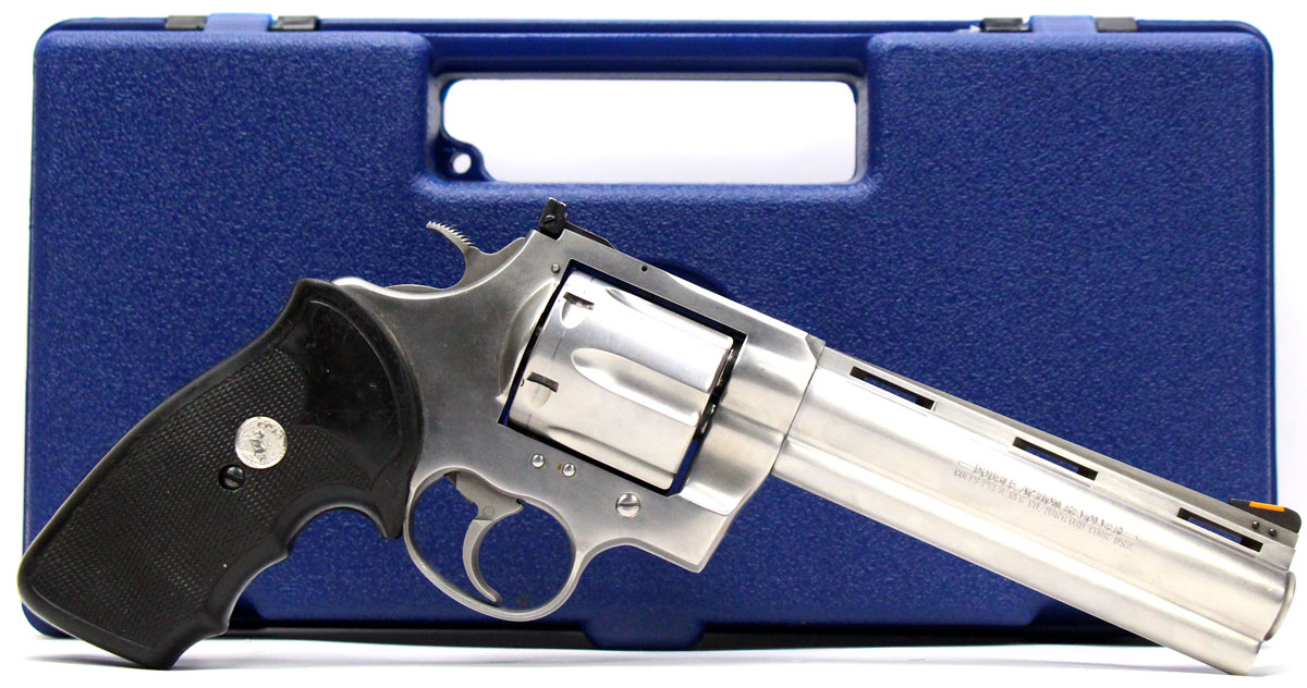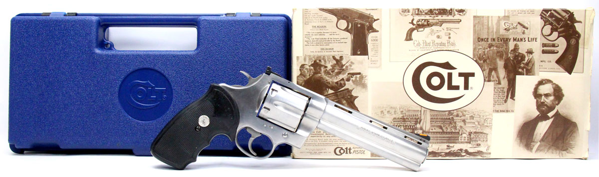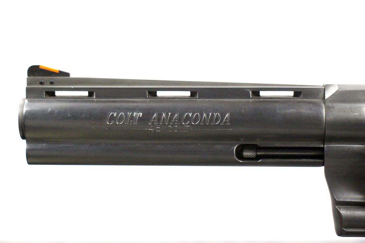 This is a collectible Colt Anaconda revolver chambered in 45 Long Colt. It features a 6-inch barrel, 6-round cylinder, adjustable rear sight, orange ramp front sight, rubber grips, and stainless finish. Includes factory box and instruction manual. Overall, this Colt is in good condition with some handling wear on the barrel and normal cylinder turn lines. Based on Colt's serial lookup, this revolver was manufactured in 1993. This would be a good choice for collecting. Buy online today!