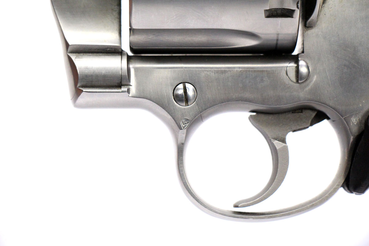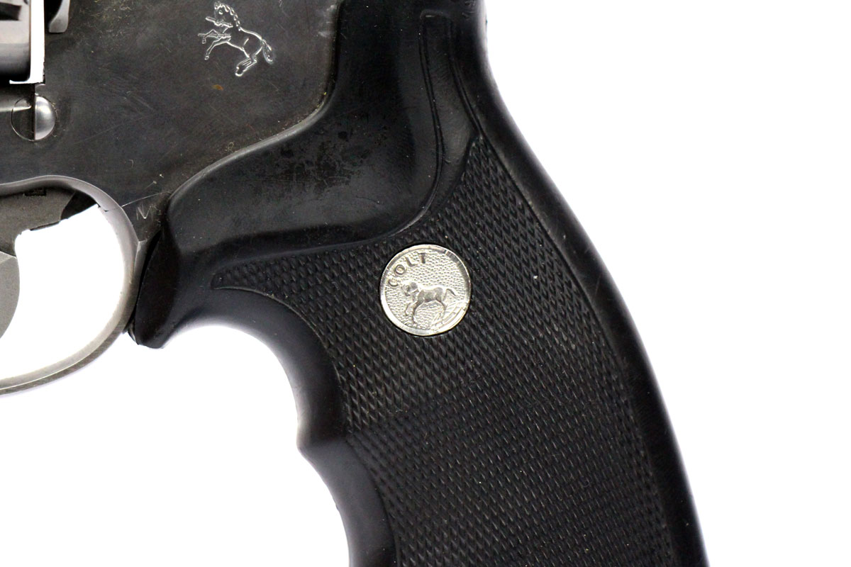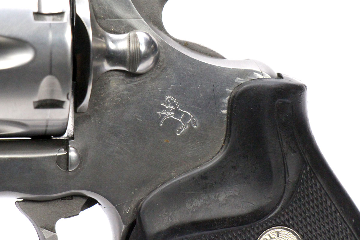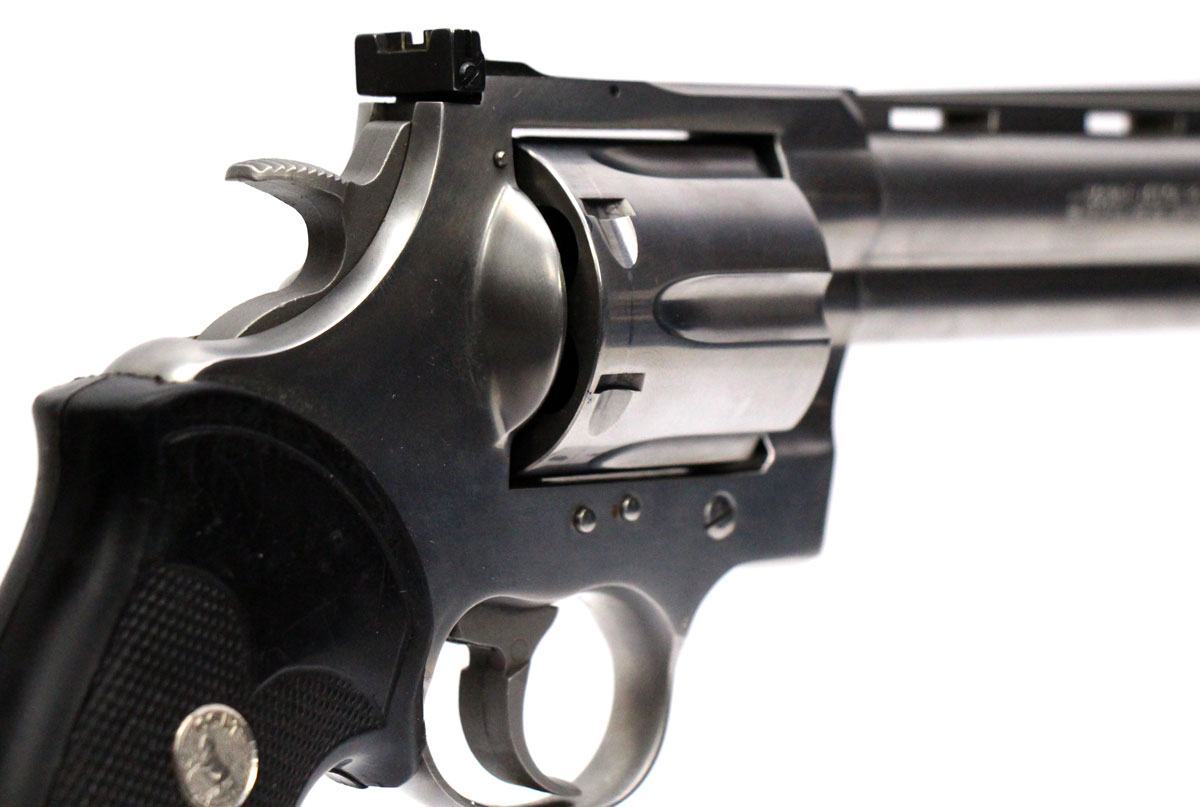 This is a collectible Colt Anaconda revolver chambered in 45 Long Colt. It features a 6-inch barrel, 6-round cylinder, adjustable rear sight, orange ramp front sight, rubber grips, and stainless finish. Includes factory box and instruction manual. Overall, this Colt is in good condition with some handling wear on the barrel and normal cylinder turn lines. Based on Colt's serial lookup, this revolver was manufactured in 1993. This would be a good choice for collecting. Buy online today!