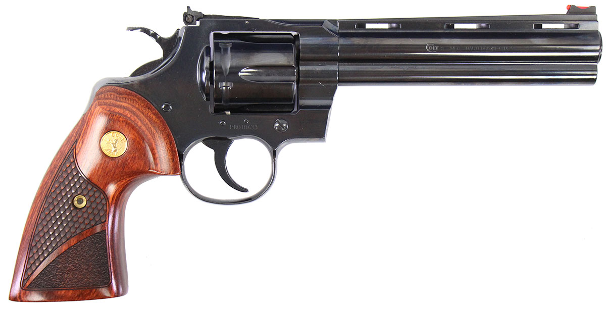 This is a used new model Colt Python chambered in 357 Magnum. It features a 6-inch vent rib barrel, 6-round cylinder, adjustable rear sight, fiber optic front sight, checkered wood grips, and blued finish. Includes factory box and instruction manual. Overall, this Colt is in very good condition with minimal wear. This would be a great choice for target shooting. Buy online today!
