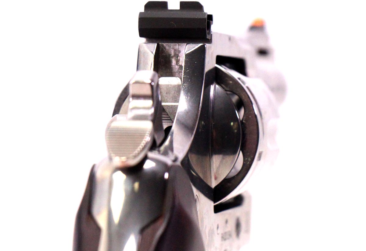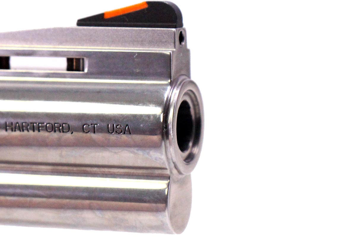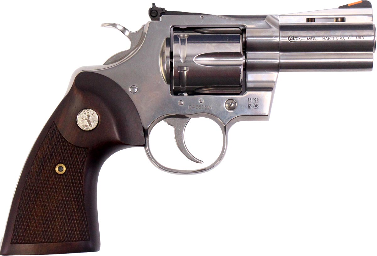 This is a used new model Colt Python chambered in 357 Magnum. It features a 3-inch vent rib barrel, 6-round cylinder, adjustable rear sight, orange ramp front sight, checkered walnut grips, and stainless finish. Includes factory box and manual. Overall, this Colt is in very good condition with minimal wear. This would be a great choice for home defense or concealed carry. Buy online today!