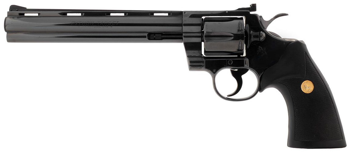 This is a Colt Python Target revolver chambered in 38 Special. It features an 8-inch barrel, blued finish, rubber grips, and 6-round cylinder. The serial number indicates this revolver was manufactured in 1980. This revolver has an excellent bore, fine timing, and strong lockup. The double action trigger pull is extremely smooth and the single action pull is very light. There is very little bluing wear and the finish shows some light scratches and a fair number of small rust spots with pitting on the frame, barrel exterior, and cylinder. This would be a great choice for anyone looking for a handgun to be used for target shooting. This would also be a good candidate to be sent back to Colt for factory refinishing. Buy online today!