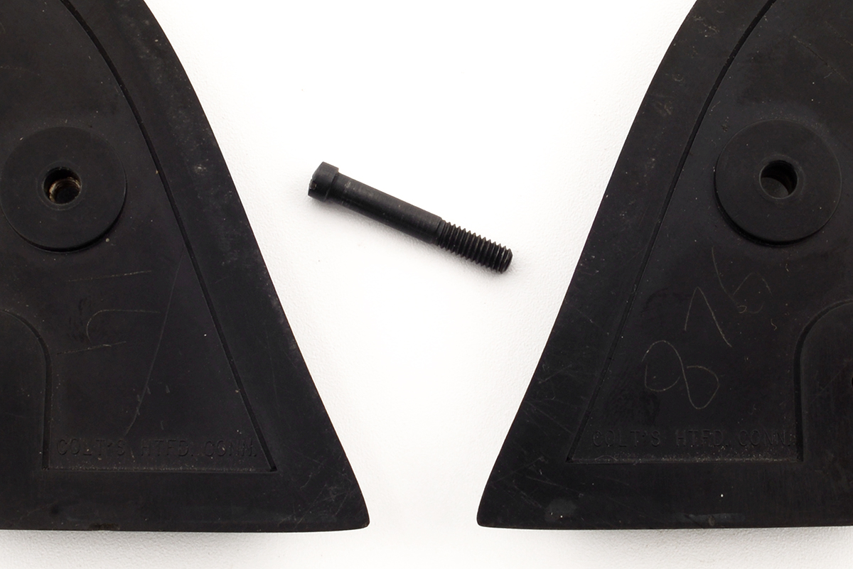 This is a set of pre-owned Colt black checkered grips for a Single Action Army (SAA) revolver. It features black synthetic construction, Colt logo at the top and Eagle with shield emblem at the bottom, the inside on both grips are marked "COLT'S HTFDM CONN and numbered to the gun they were originally on. Overall condition is good with some light scuffs and scratches from use. Buy online today!