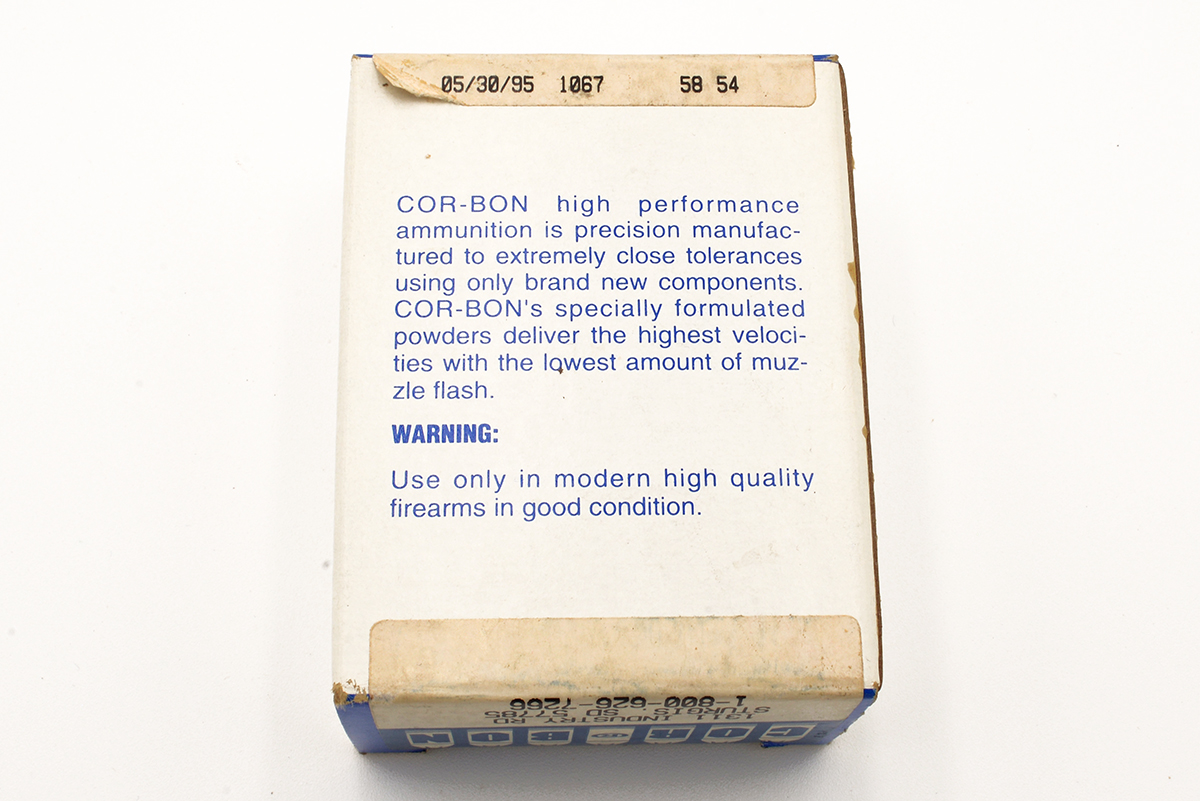 This is pre-owned Cor-Bon .38 Special +P+ ammo known as "Treasury Load". It features 20 rounds of 110 grain jacketed hollow point bullets, 1250 fps velocity, nickel plated cases and was manufactured in 1995. Overall condition is very good, the boxes have some wear, creases and soft edges. Buy online today!