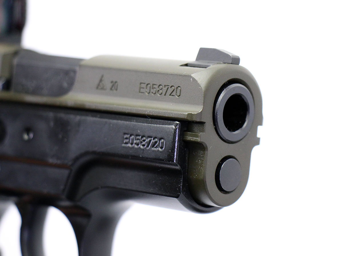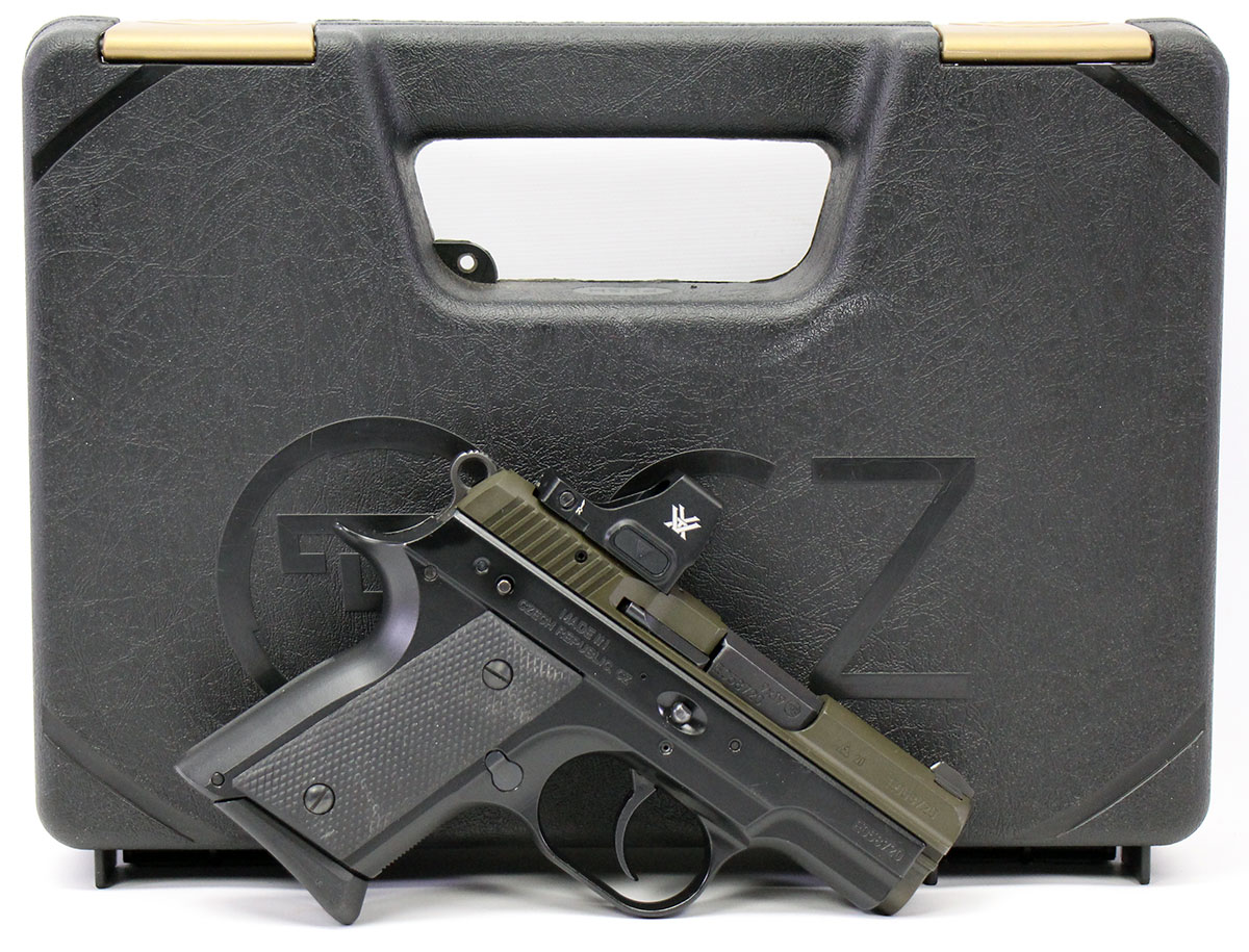 This is a used CZ 2075 D Rami pistol chambered in 9mm. It features a 3-inch barrel, 10-round magazine, tritium front sight, Vortex Defender CCW red dot sight, decocker, OD green slide, and rubber grips. Includes factory box, instruction manual, one 10-round magazine, one 14-round magazine, and cleaning brush. Overall, this CZ is in good condition with normal wear on the barrel and slide. This would be a good choice for concealed carry. Buy online today!