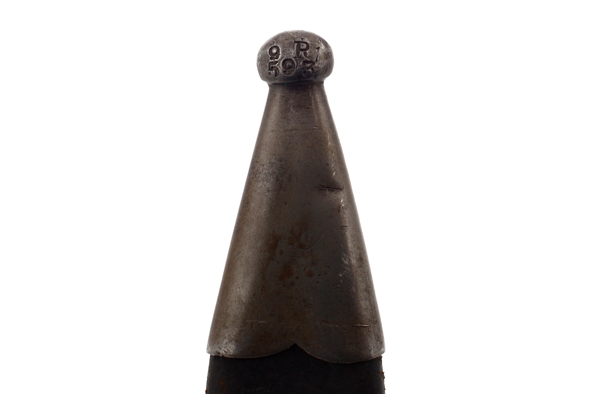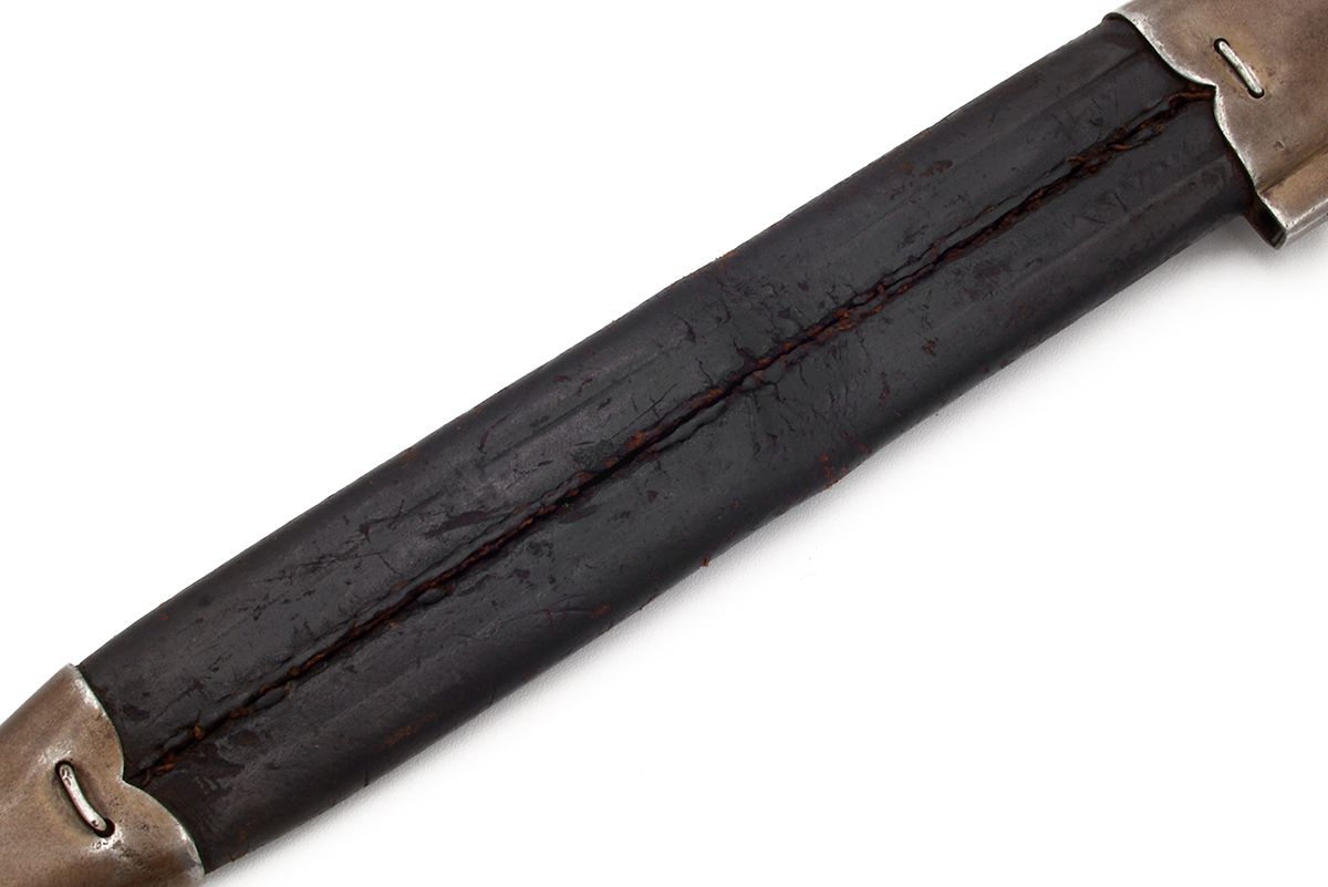 This is a Danish M1889 bayonet fop the Krag Jorgensen rifle. It features an 8.75" blade with an overall length of 15.5" and is marked "ALEX COPPEL SOLINGEN" on the ricasso and "91" on the guard indicating it was manufactured in 1891. The pommel is unit marked "9R.682" on one side and serial numbered "22270" on the other. Overall condition is fair with the original edge, the leather handle is worn with a crack on the right panel. The metal has some tarnishing and light patina. The leather scabbard has some cracks, scuffs and scratches, the seam down the middle has come apart. Buy online today!
