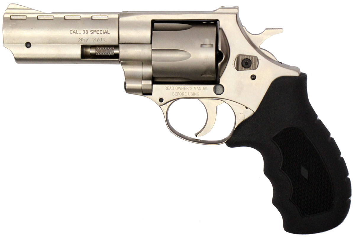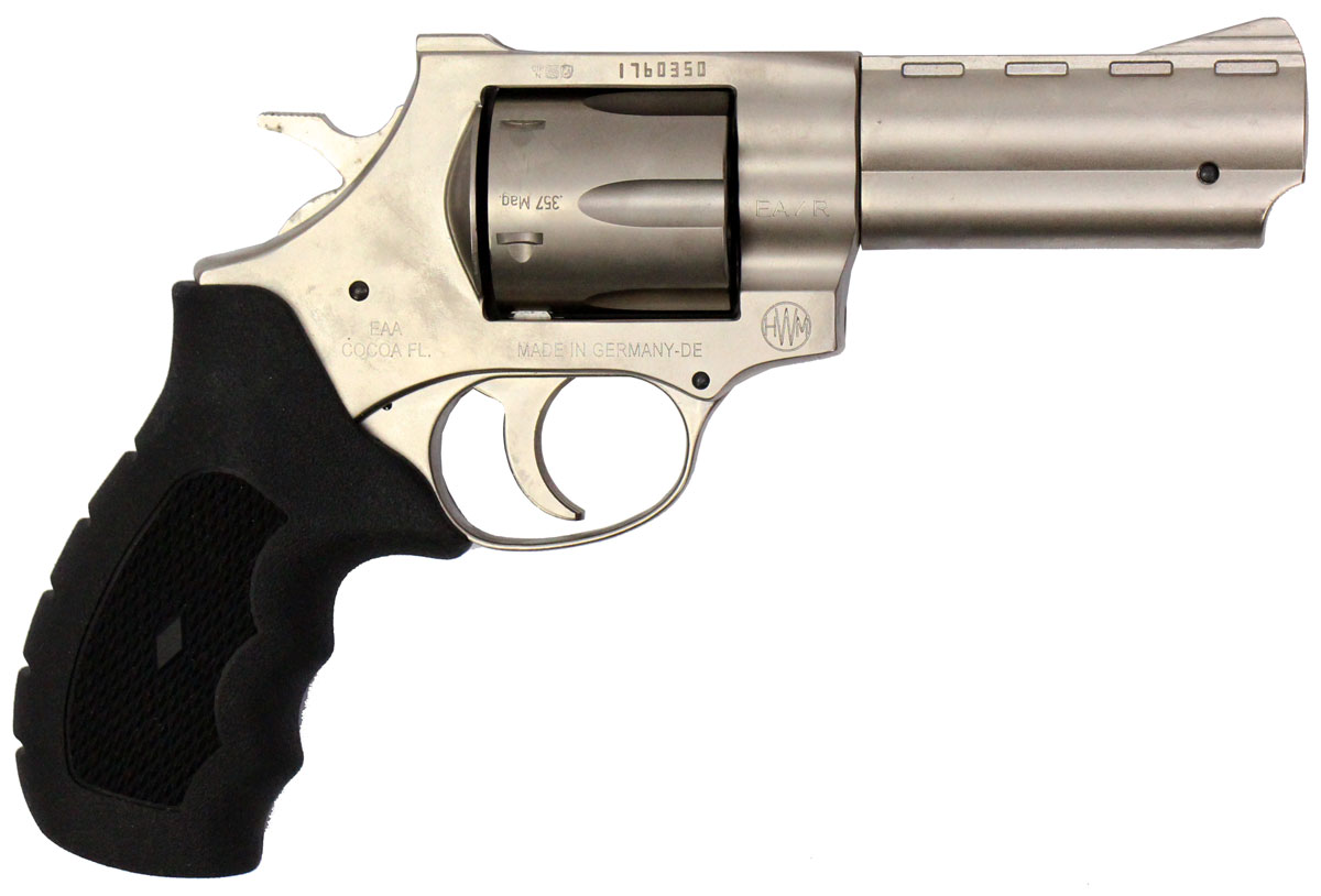 This is a used EAA Weihrauch Windicator revolver chambered in 357 Magnum. It features a 3.7-inch barrel, 6-round cylinder, fixed sights, nickel finish, and rubber grips. Overall, this revolver is in good condition with normal use cylinder turn lines. This would be a good choice for concealed carry. Buy online today!