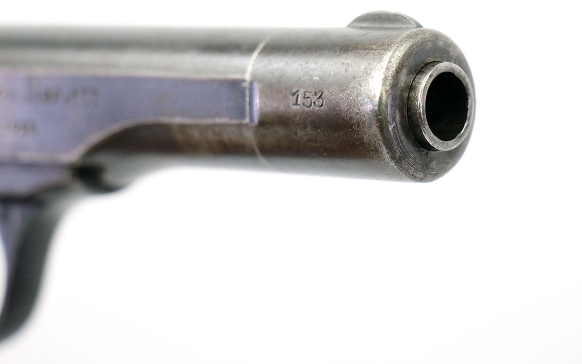 This is an extremely rare FN Model 1922 Dutch military contract pistol chambered in 380 ACP. In 1925 1,200 of these pistols were ordered for the Koninklijke Marechaussee (Royal Military Constabulary) which is what the "Kon.Mar" stands for on the left side of the slide. Of those, this pistol is number 153. As noted Anthony Vanderlinden book "FN Browning Pistols" there were only four others known at the time. in recent years a few others have turned up including this one but still fewer than 10 in total. This is considered one among the rarest Model 1922 variations and very rarely ever appear on the market for sale. This particular example is made even more unique by the fact it is chambered in 380 ACP. Known examples with matching barrels appear to be chambered in 32 ACP. Overall condition of this pistol is good. The bore has plenty of shine with strong rifling and all numbers are matching. There is wear and patina to the finish with about 50% of the original bluing remaining. The included magazine is an aftermarket replacement. This would be a great addition to any rare firearm collection. Buy online today!