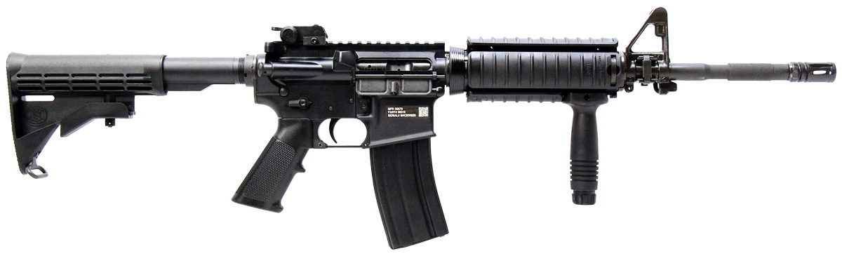 This is a used FN M4 Military Collector carbine chambered in 5.56 NATO. It features a 14.5-inch barrel with a pinned-and-welded flash hider, 30-round magazine, A2 front sight post, MA Tech rear sight, Knights Armament picatinny handguard, vertical foregrip, and ambidextrous safety. Includes factory box and manual. Overall, this carbine is in very good condition with minimal wear. Bore condition is good with crisp rifling. This would be a good choice for home defense. Buy online today!