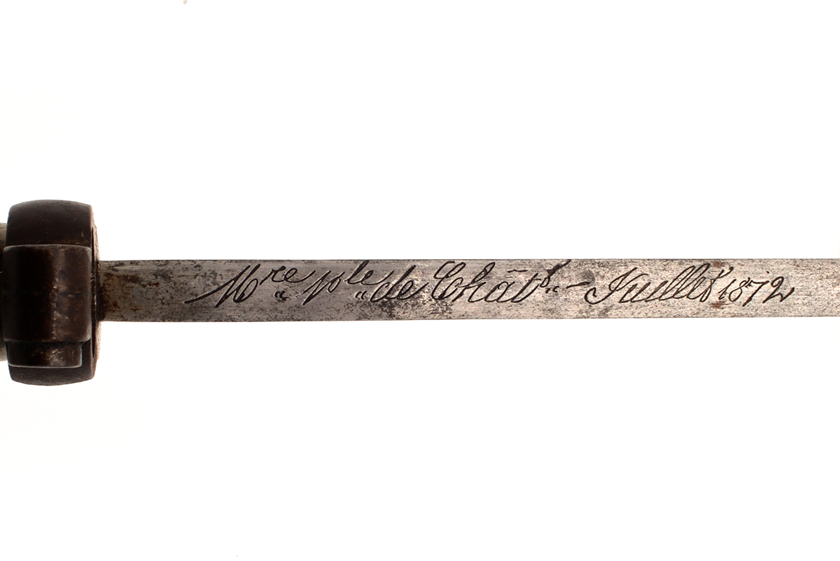 This is a French Model 1866 (M1866) Yataghan Sword Bayonet by Tulle Arsenal for the Chassepot rifle. It features a 22.75" blade with overall length of 27.5", the manufacturer and date is etched along the blade spine with a date of 1872. The condition of this bayonet is good with the original unsharpened edge, all of the metal has some tarnishing, rust spots and patina. There is no scabbard included with this bayonet. Buy online today!