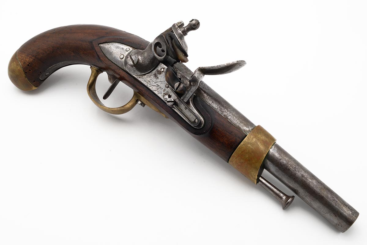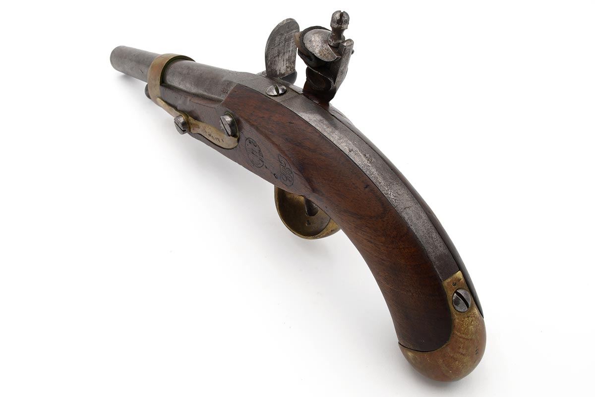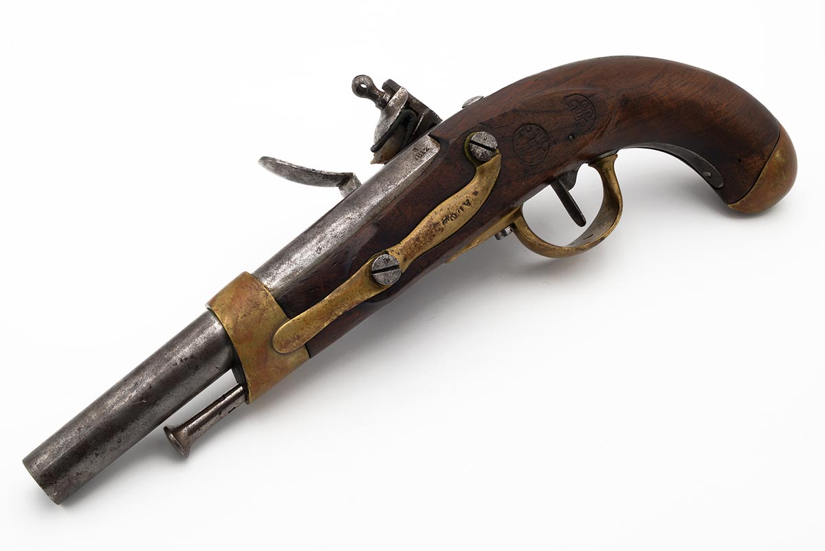The Pistolet modèle An XIII was a flintlock cavalry pistol, in service in French units from 1806. It was mostly inspired by the Pistolet modèle An IX, which it succeeded, but also incorporated elements of the Navy pistolet modèle 1786, notably the barrel mountings. A critical difference between the Pistolet modèle 1777/1786's front barrel band and the one used on the Pistolet modèle An XIII was that instead of being pinned into place like the former, it was instead screwed into place and the barrel band was lighter weight; mostly solving the overheating problem the barrel band design caused in the Pistolet modèle 1777/1786. This variant was ultimately made to reduce the cost and simplify the weapon compared to the Pistolet modèle An IX while retaining similar reliability and ease of care as the previous pattern. Over 300,000 pistols were made, mostly between 1806 and 1814 in Charleville, Maubeuge and St-Etienne. The Pistolet modèle An XIII was designed to equip mounted units, each horseman using two pistols. It was also used by the Navy. Both the An IX and An XIII patterns co-existed for a time after initial introduction, however some of the An IX Pattern Pistols were upgraded to the An XIII standard. An improved version, known as the M1822, was produced after the Napoleonic Wars. They were kept in service well into the 1840s, at which date the pistols still in usage were converted to use percussion caps.