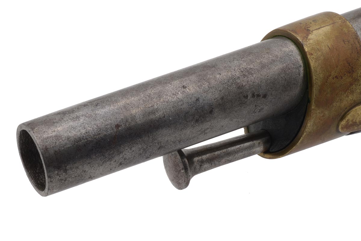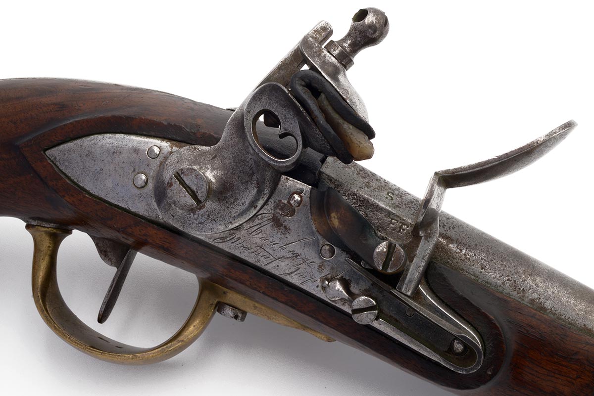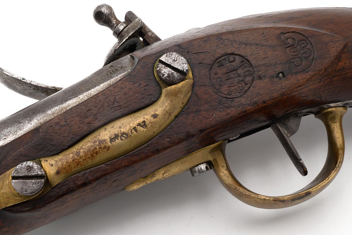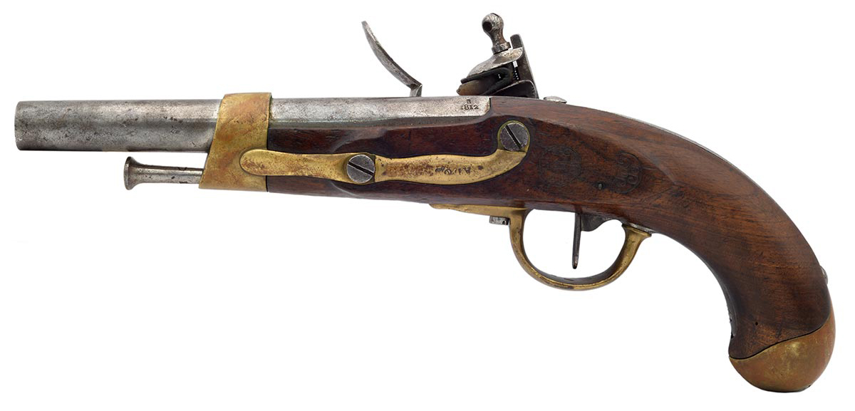 The Pistolet modèle An XIII was a flintlock cavalry pistol, in service in French units from 1806. It was mostly inspired by the Pistolet modèle An IX, which it succeeded, but also incorporated elements of the Navy pistolet modèle 1786, notably the barrel mountings. A critical difference between the Pistolet modèle 1777/1786's front barrel band and the one used on the Pistolet modèle An XIII was that instead of being pinned into place like the former, it was instead screwed into place and the barrel band was lighter weight; mostly solving the overheating problem the barrel band design caused in the Pistolet modèle 1777/1786. This variant was ultimately made to reduce the cost and simplify the weapon compared to the Pistolet modèle An IX while retaining similar reliability and ease of care as the previous pattern. Over 300,000 pistols were made, mostly between 1806 and 1814 in Charleville, Maubeuge and St-Etienne. The Pistolet modèle An XIII was designed to equip mounted units, each horseman using two pistols. It was also used by the Navy. Both the An IX and An XIII patterns co-existed for a time after initial introduction, however some of the An IX Pattern Pistols were upgraded to the An XIII standard. An improved version, known as the M1822, was produced after the Napoleonic Wars. They were kept in service well into the 1840s, at which date the pistols still in usage were converted to use percussion caps.
