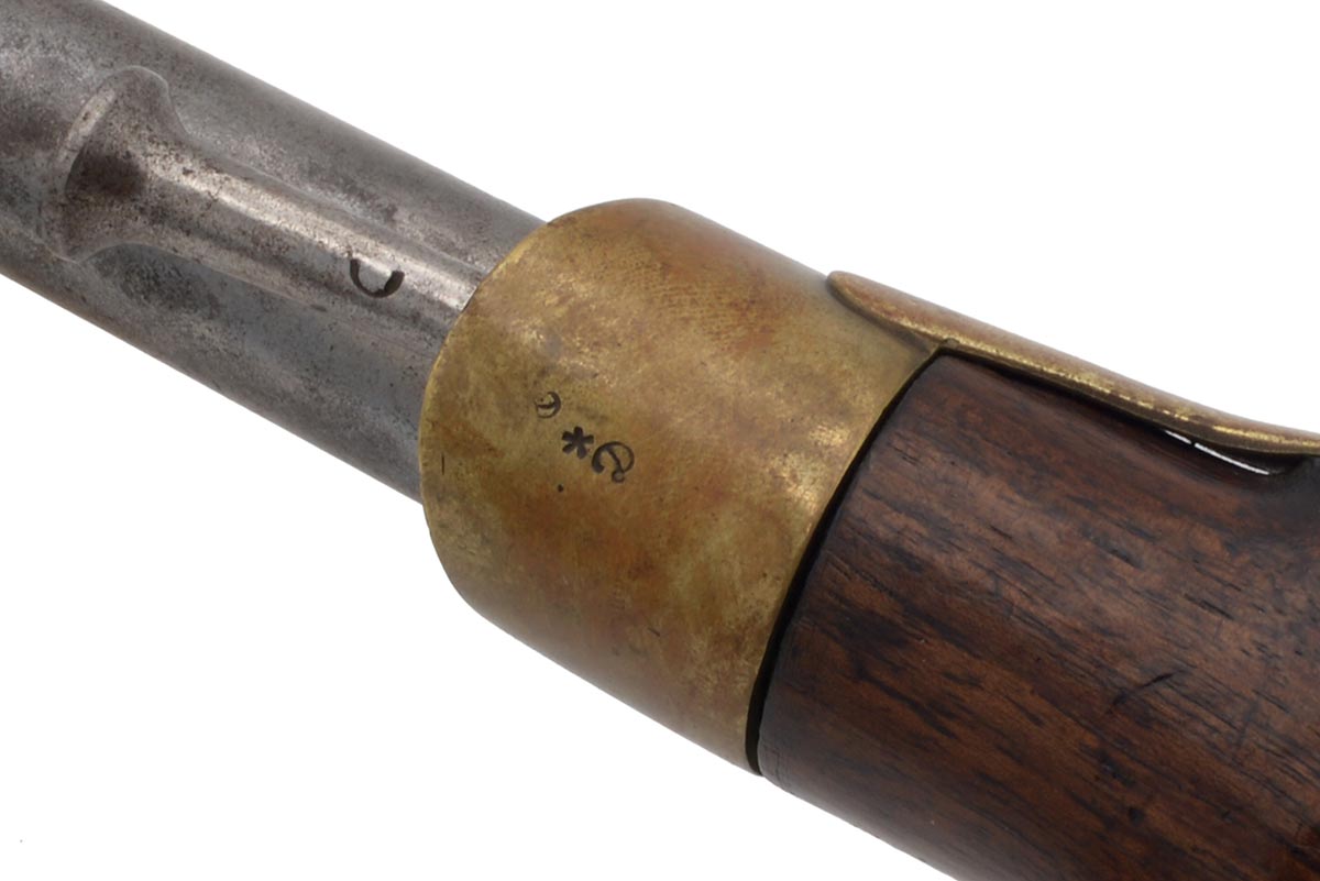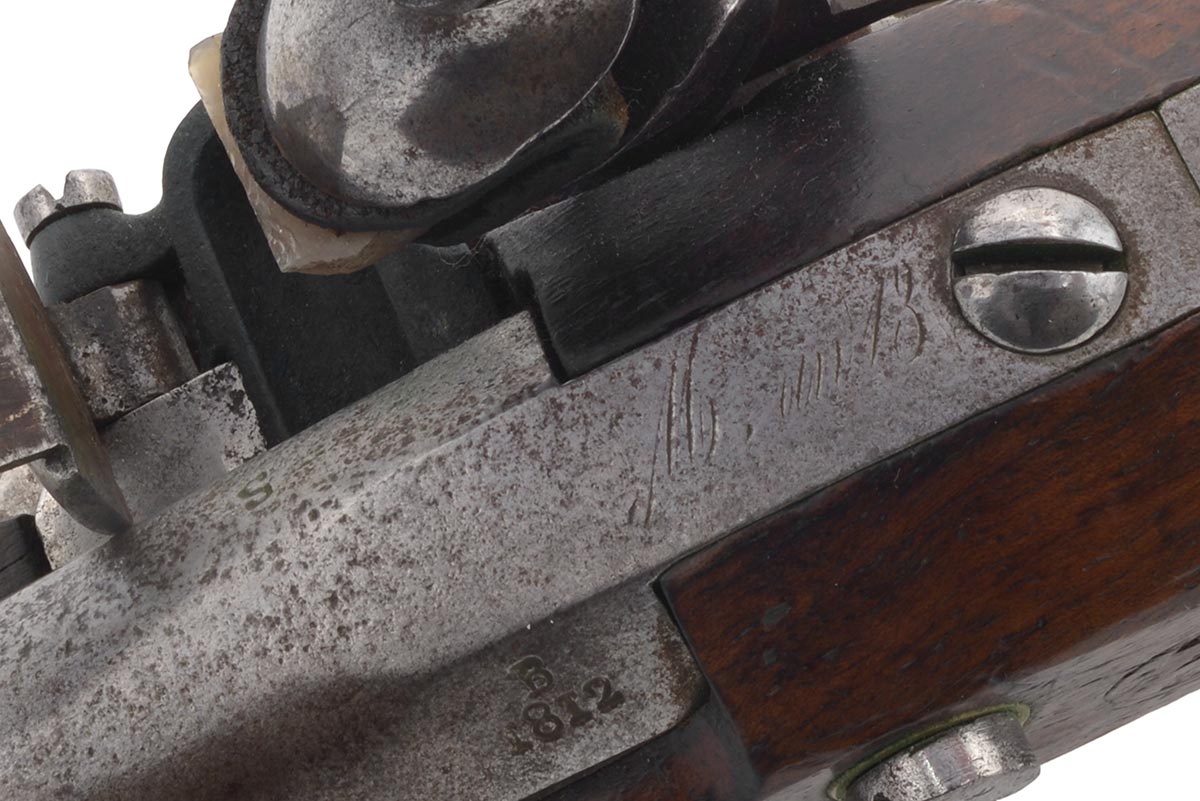 This is a French Napoleonic era Model AN XIII Flintlock Cavalry Pistol chambered in 69 caliber. It was produced by Maubeuge Arsenal in 1812 (according to the chamber and cartouche date). It features a 7.5-inch barrel, original flintlock action, large brass pistol butt cap, proofed round ball ram rod, and numerous proof/arsenal marks. The side plate sports in script "Maubeuge Manuf. Imp" and the rear top barrel flat "M . an 13". Overall, this antique is in great shape for a French Dragoon pistol made well over 200 years ago. The white steel show signs of pitting through the finish and the stock features bumps and scratches throughout. This would make a great choice for those looking to add a unique piece of history to their collection.