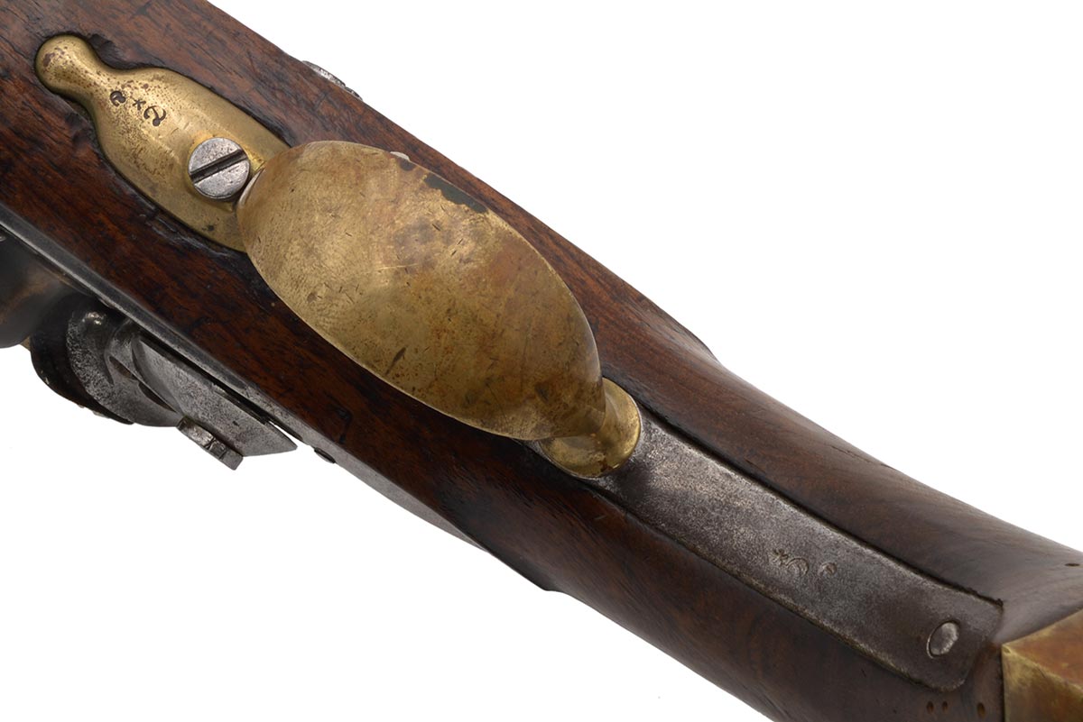 This pistol does not feature a Serial Number however the bottom butt cap features the number 2 in script. These pistols were generally issued in pairs, so this maybe the second one issued in a pair.