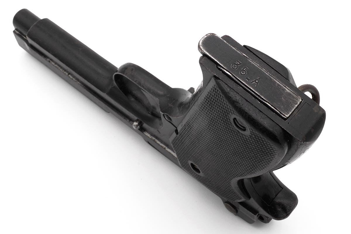 This is a French S.A.C.M (Société Alsacienne de Constructions Mécaniques) Mle 1935.A (Model 1935A) pistol chambered in 7.65x20 Longue. It features a 4.25-inch barrel with 8-round capacity magazine, and black enamel finish. The serial number prefix is "G" which would put the date of manufacture at 1948. The number at the end the slide is different and the barrel is only marked "A". The 1935A was developed in 1936 as direct licensed predecessor to the Sig P210 and was designed by Charles Petter for the French Army. Sig later purchased this license then improved upon the design and developed the P210. Overall condition of this pistol is good. The bore has plenty of shine with strong rifling and there are no import markings. This would be a great addition to any military surplus collection. Buy online today!