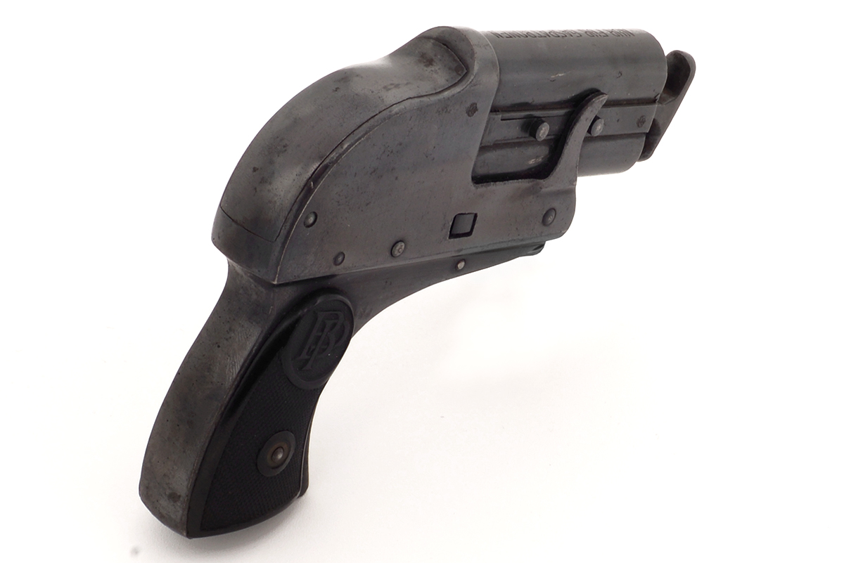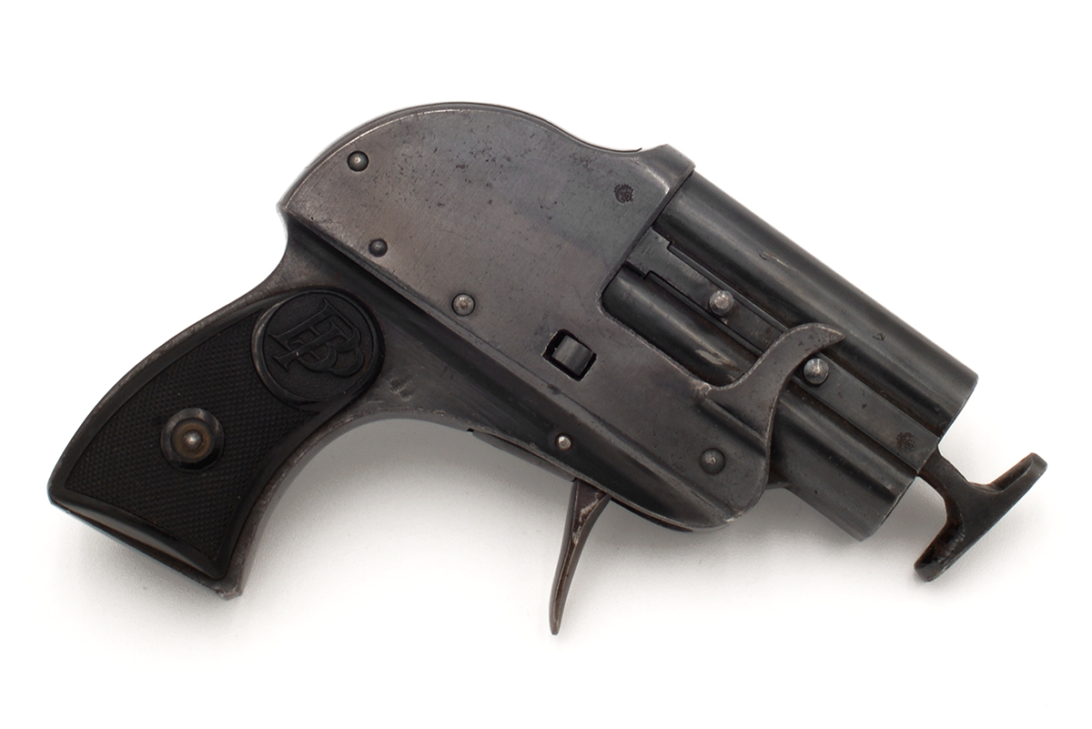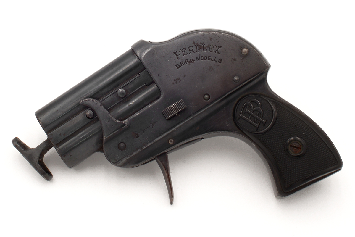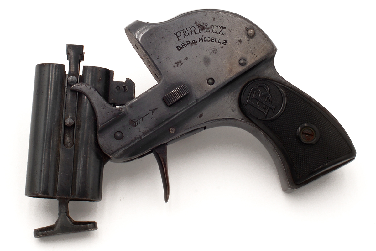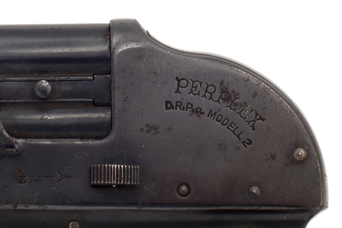 This is a German Perplex Model 2 double barrel tear gas pistol from the 1920s. It features twin 2-inch barrels chambered in 12mm and designed to shoot Schientod tear gas rounds. The overall condition is good with some light wear and patina to the bluing. Mechanically, this gas gun appears functional. There is a barrel block added to the end of the barrels, the reason for this unusual feature is unknown but we can only assume that it added to prevent the use of any projectile ammunition.