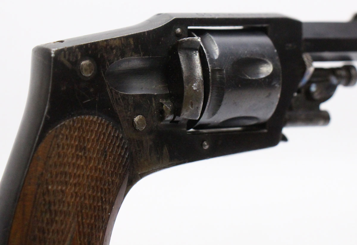 This is a classic German Velo Dog revolver chambered in 25 ACP. It features a 2-inch barrel, 5-round cylinder, folding trigger, manual safety, and wood grips. Overall, this revolver is in good condition with normal age-related finish wear on the frame. Cylinder timing and lockup is good. The barrel and frame have German crown over N proof marks. This would be a good choice for classic gun collectors. Buy online today!