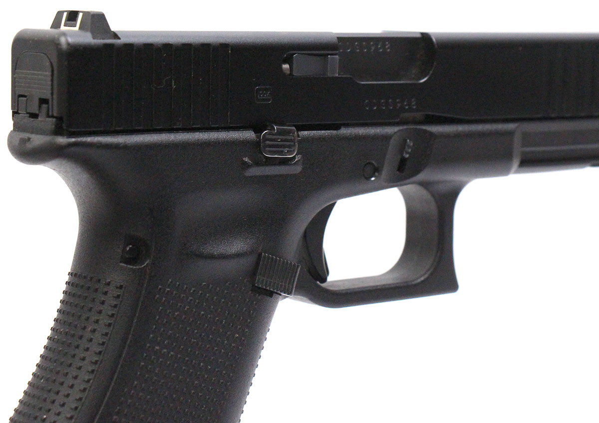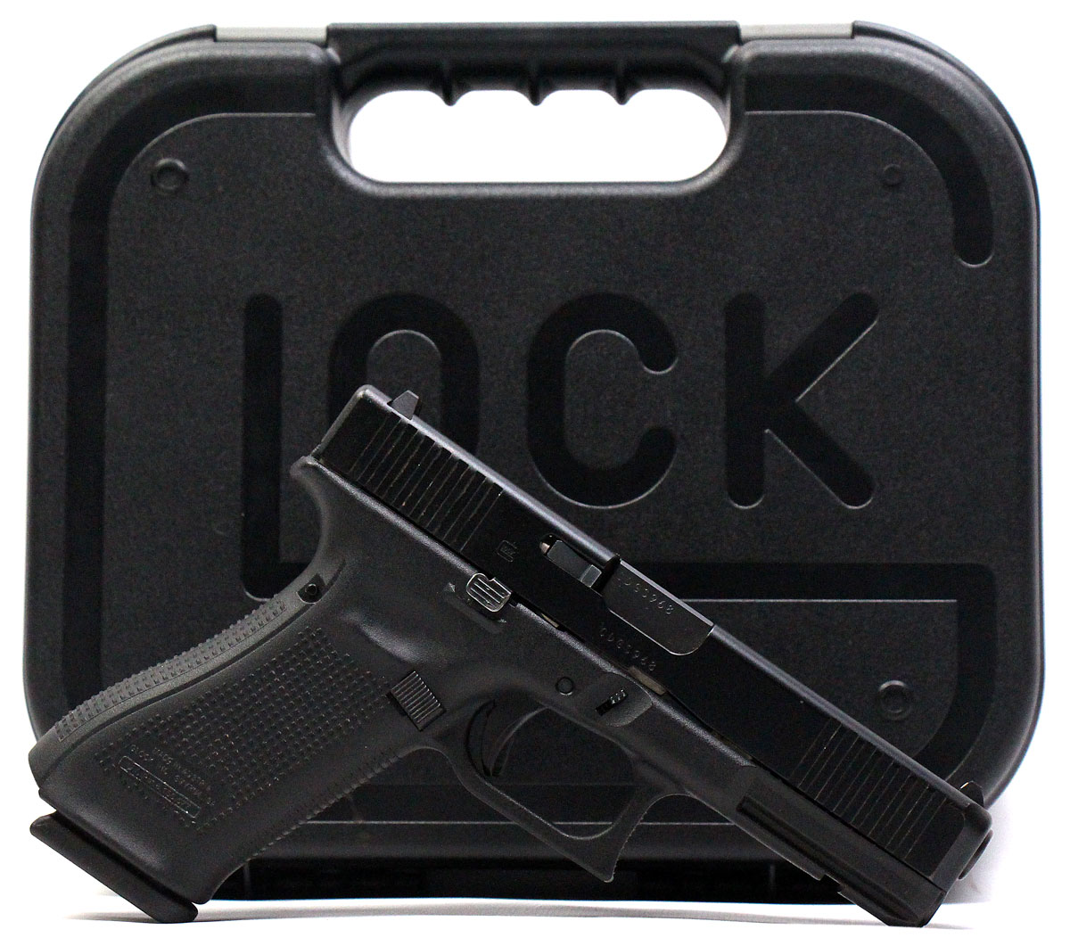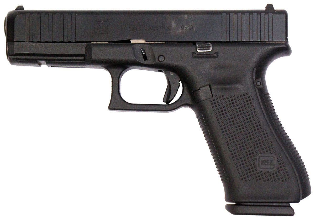 This is a used Glock 17 Gen5 pistol chambered in 9mm. It features a 4.49-inch barrel, 17-round magazines, factory contrast sights, and accessory rail. Includes factory box, manual, and two magazines. Overall, this Glock is in good condition with some wear on the slide and barrel. The magazine release button has been switched to the right side for left-handed use and is reversible. This would be a good choice for home defense. Buy online today!