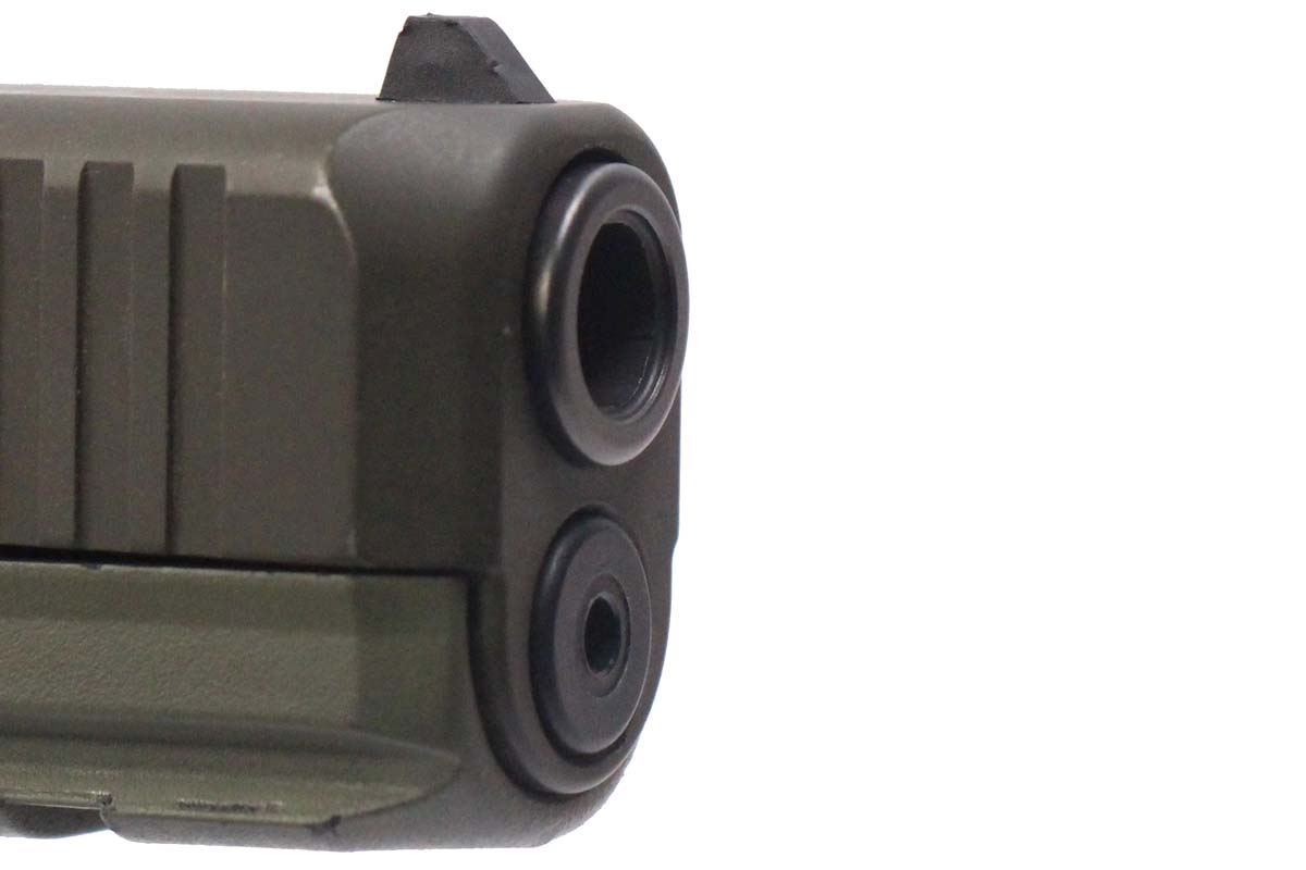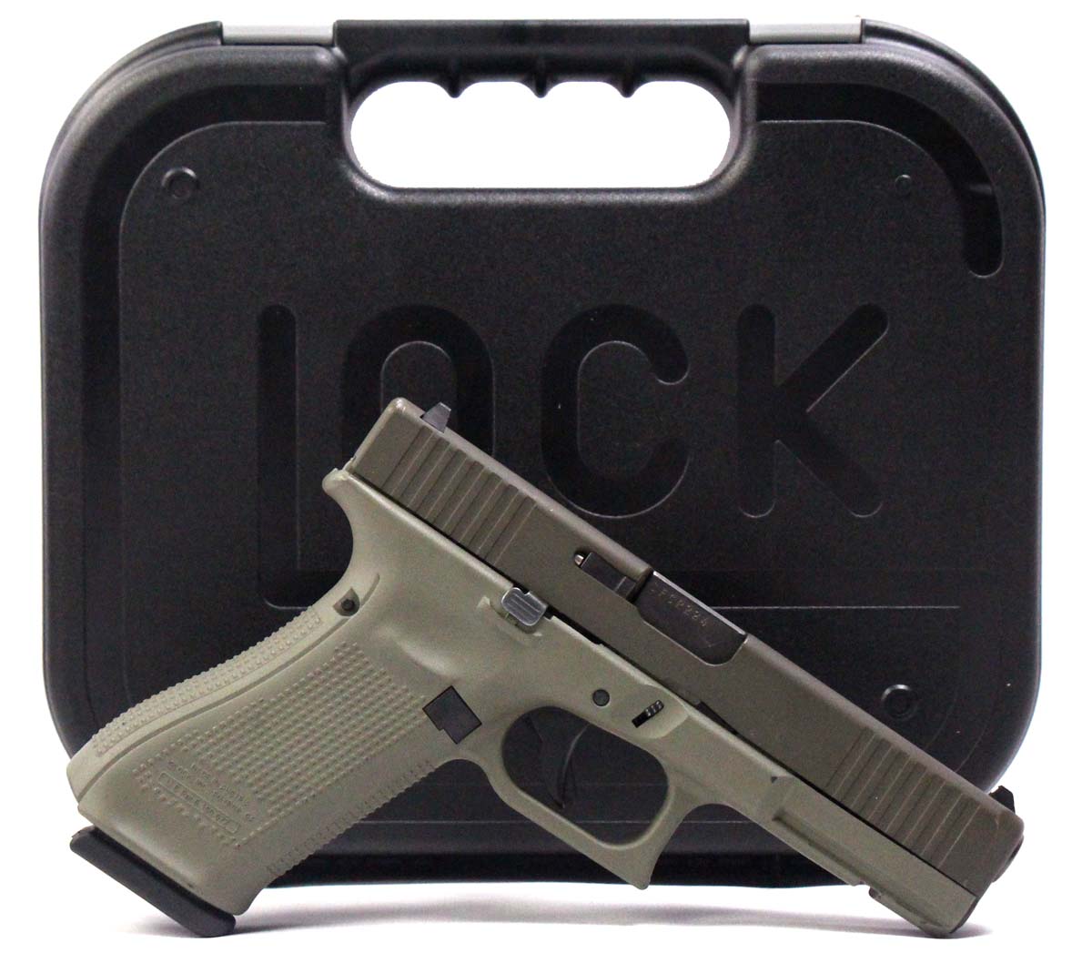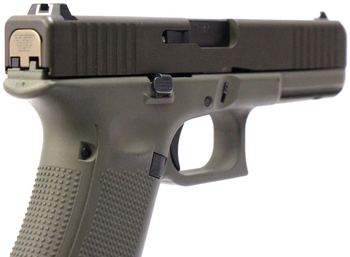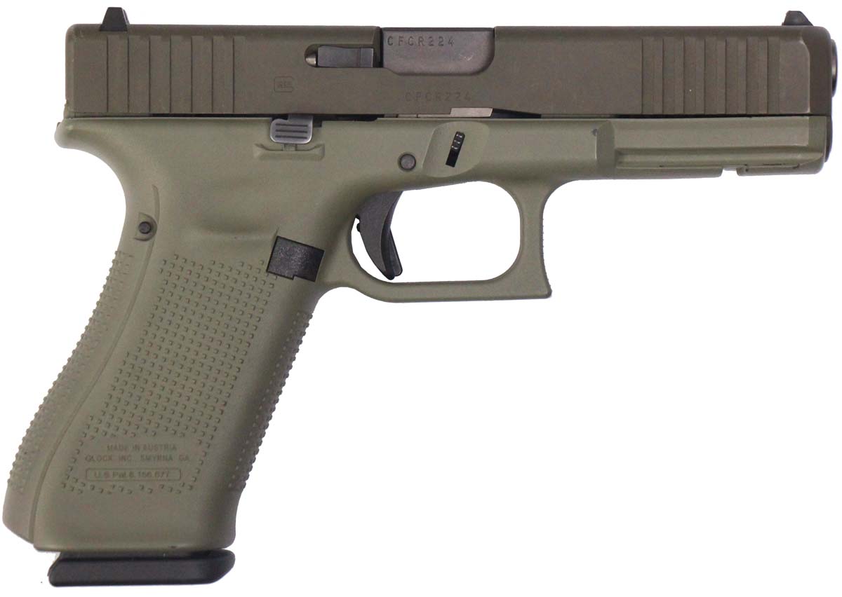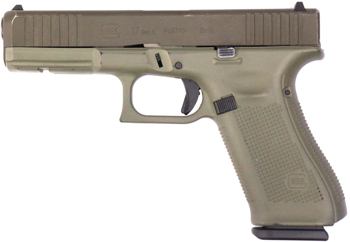 This is a used Glock 17 Gen5 pistol chambered in 9mm. It features a 4.49-inch barrel, 17-round magazines, factory contrast sights, green Cerakote finish, and accessory rail. Includes factory box, manual, and three magazines. Overall, this Glock is in good condition with normal use wear on the slide, frame, and barrel. This would be a good choice for home defense. Buy online today!