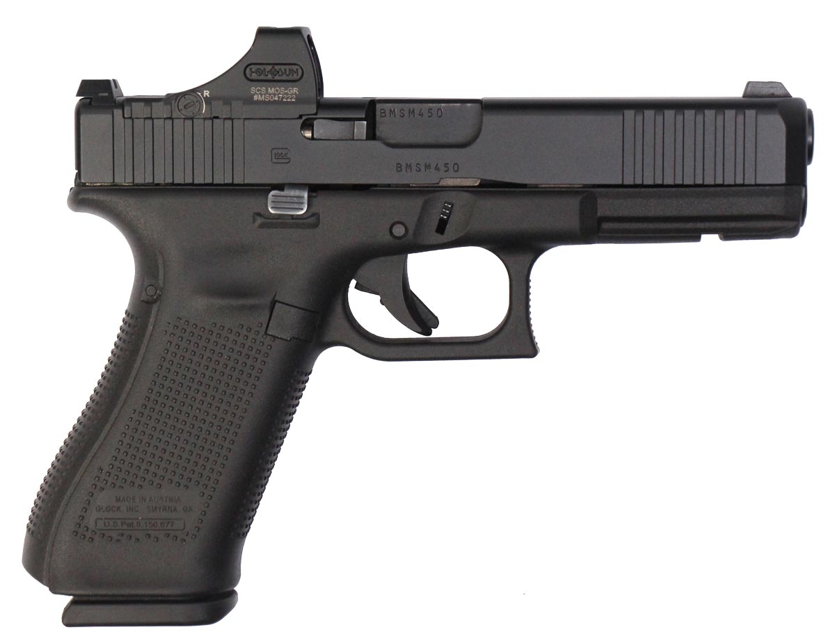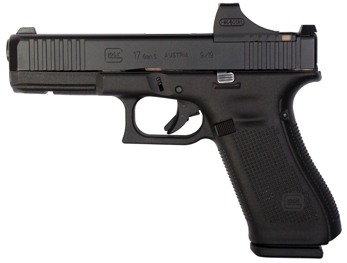 This is a used Glock 17 Gen5 pistol chambered in 9mm. It features a 4.49-inch barrel, 17-round magazines, fixed sights, Holosun SCS-MOS green dot sight, and accessory rail. Includes factory box, manual, and two magazines. Overall, this Glock is in good condition with some wear on the slide and barrel. This would be a good choice for home defense. Buy online today!